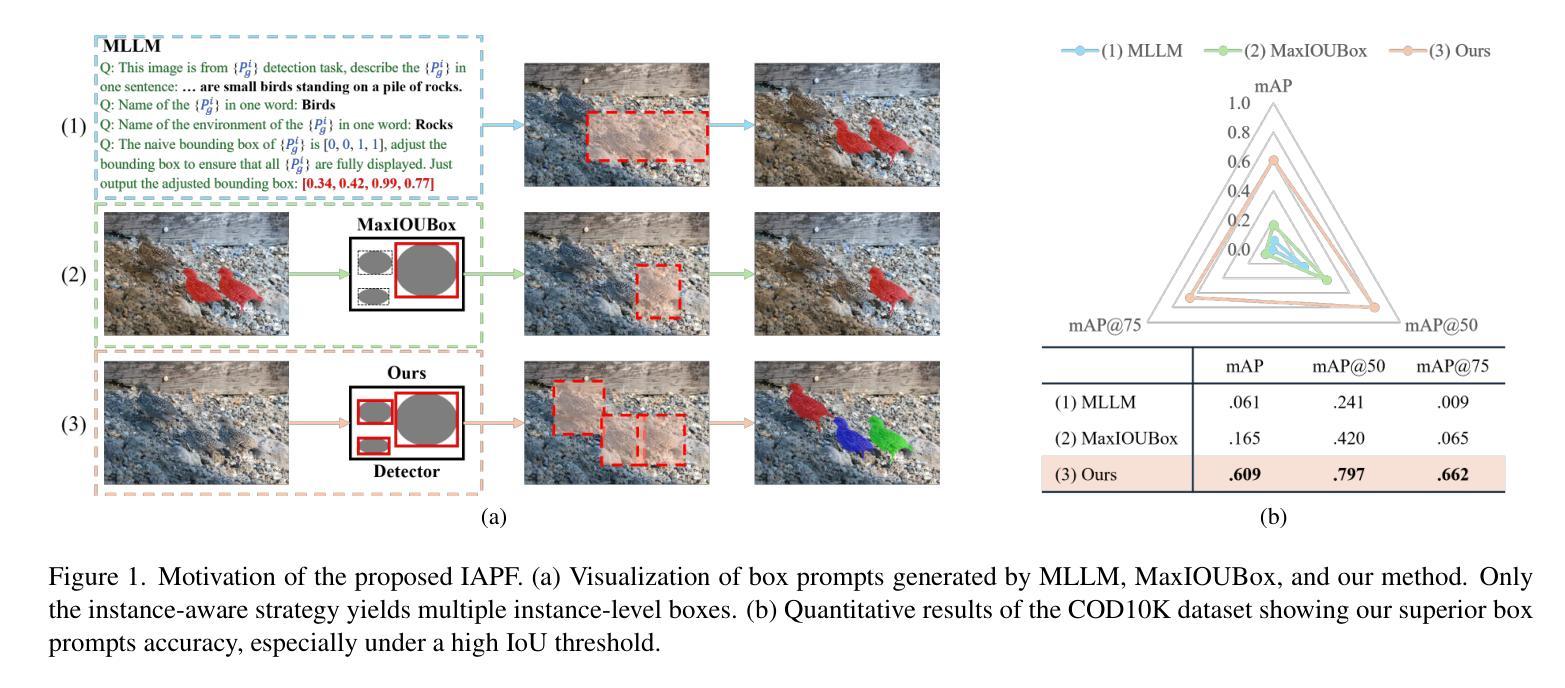 - IAPF包括一个实例掩膜生成器,产生精确实例级框提示和单前景多背景提示策略。