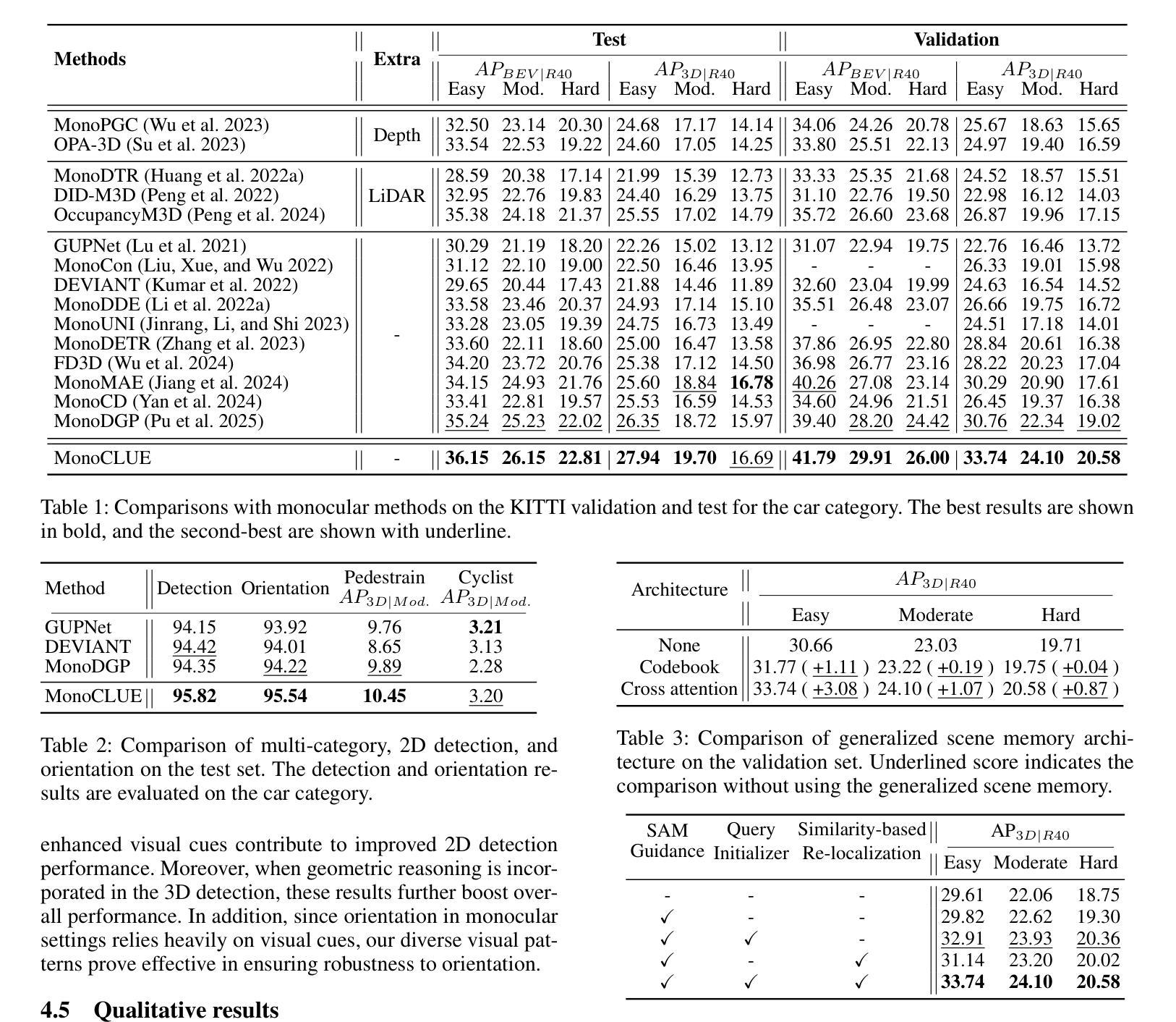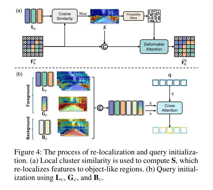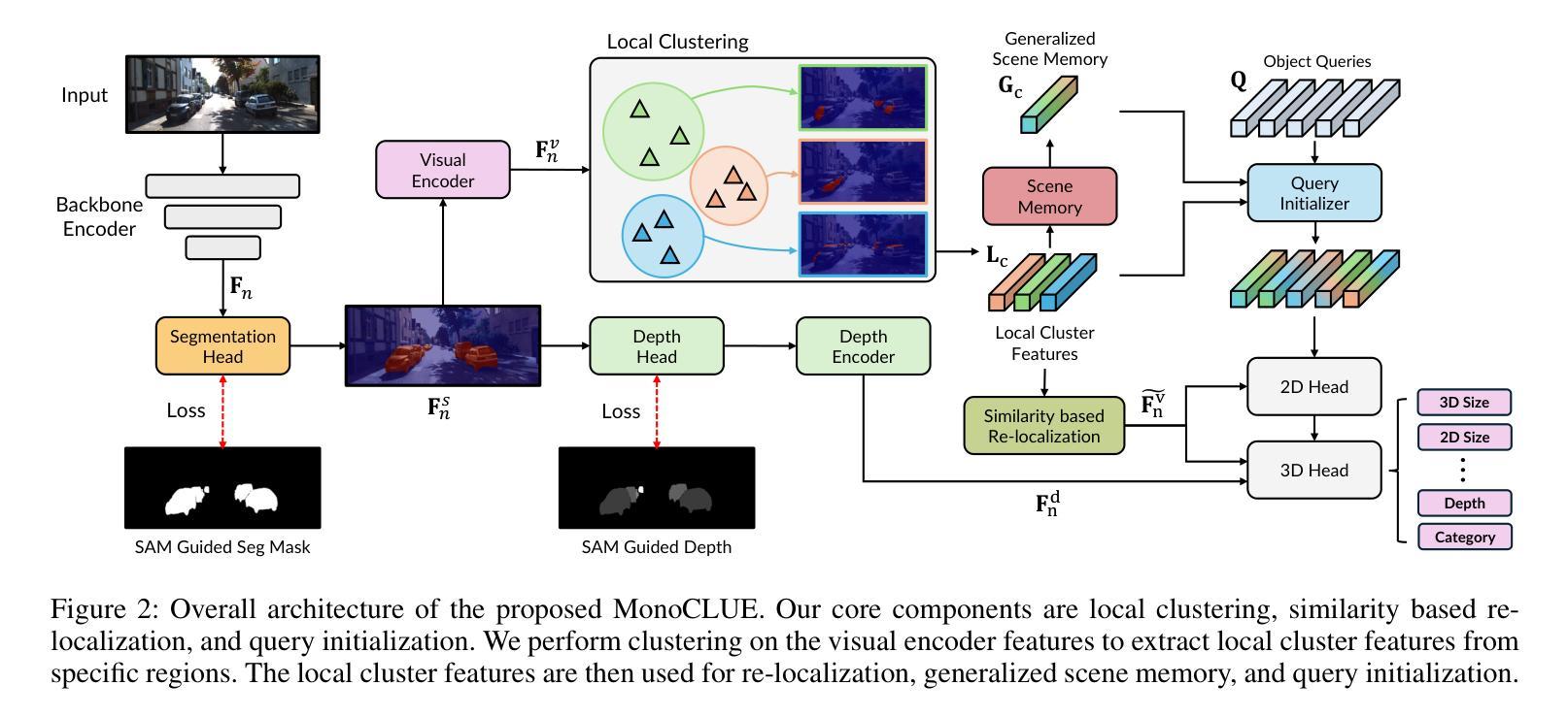 单目3D目标检测为自动驾驶提供了经济高效的解决方案,但存在深度不明确和视野有限的缺点。这些约束导致了缺乏几何线索,以及在遮挡或截断场景中的精度降低。虽然最近的方法通过加入深度信息来解决几何歧义问题,但它们忽略了对于稳健识别至关重要的视觉线索。我们提出MonoCLUE,它通过利用局部聚类和视觉特征的广义场景记忆来增强单目3D检测。首先,我们对视觉特征执行K-means聚类,以捕获独特的对象级外观部分(例如引擎盖、汽车顶部),从而提高对部分可见对象的检测能力。聚类特征被传播到各个区域,以捕获具有相似外观的对象。其次,我们通过聚集图像中的聚类特征来构建广义场景记忆,提供一致的表示形式,这些表示形式可以推广到各个场景。这提高了对象级特征的一致性,能够在各种环境中实现稳定的检测。最后,我们将局部聚类特征和广义场景记忆整合到对象查询中,引导注意力关注信息区域。通过利用统一的局部聚类和广义场景记忆策略,MonoCLUE在遮挡和有限可见度的情况下实现了稳健的单目3D检测,并在KITTI基准测试中达到了最先进的性能。