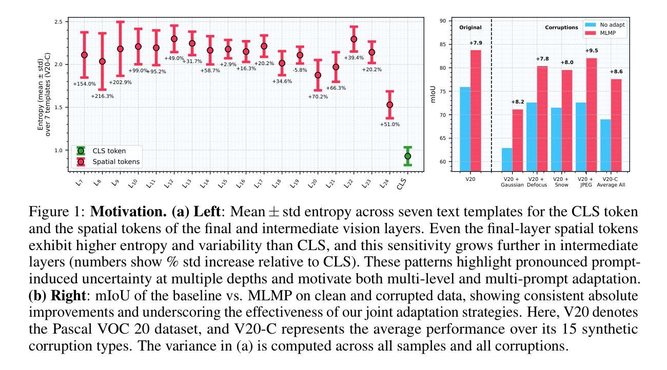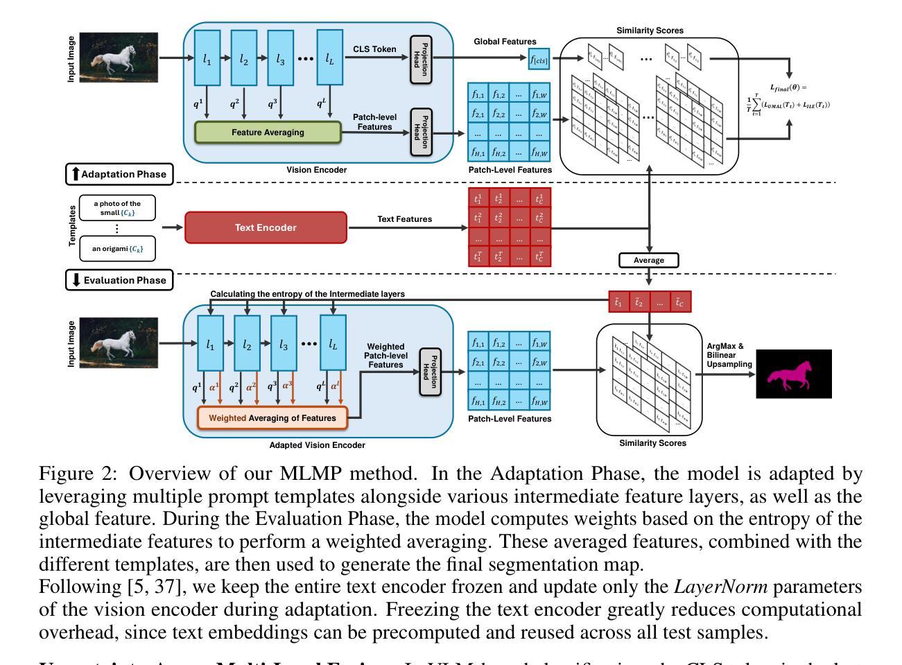 针对开放词汇语义分割(OVSS)任务中的测试时间自适应问题,提出了一个新型的多层次多提示(MLMP)熵最小化方法。该方法结合了中间视觉编码器层的特征,并在全局CLS标记和局部像素级使用不同的文本提示模板进行。此方法可作为任何分割网络的即插即用模块,无需额外的训练数据或标签,甚至在单个测试样本上也能保持有效。此外,还引入了一个全面的OVSS TTA基准套件,为未来TTA研究提供了标准化和全面的测试平台。实验表明,该方法在分割任务上相对于直接采用TTA分类基准线具有显著优势。