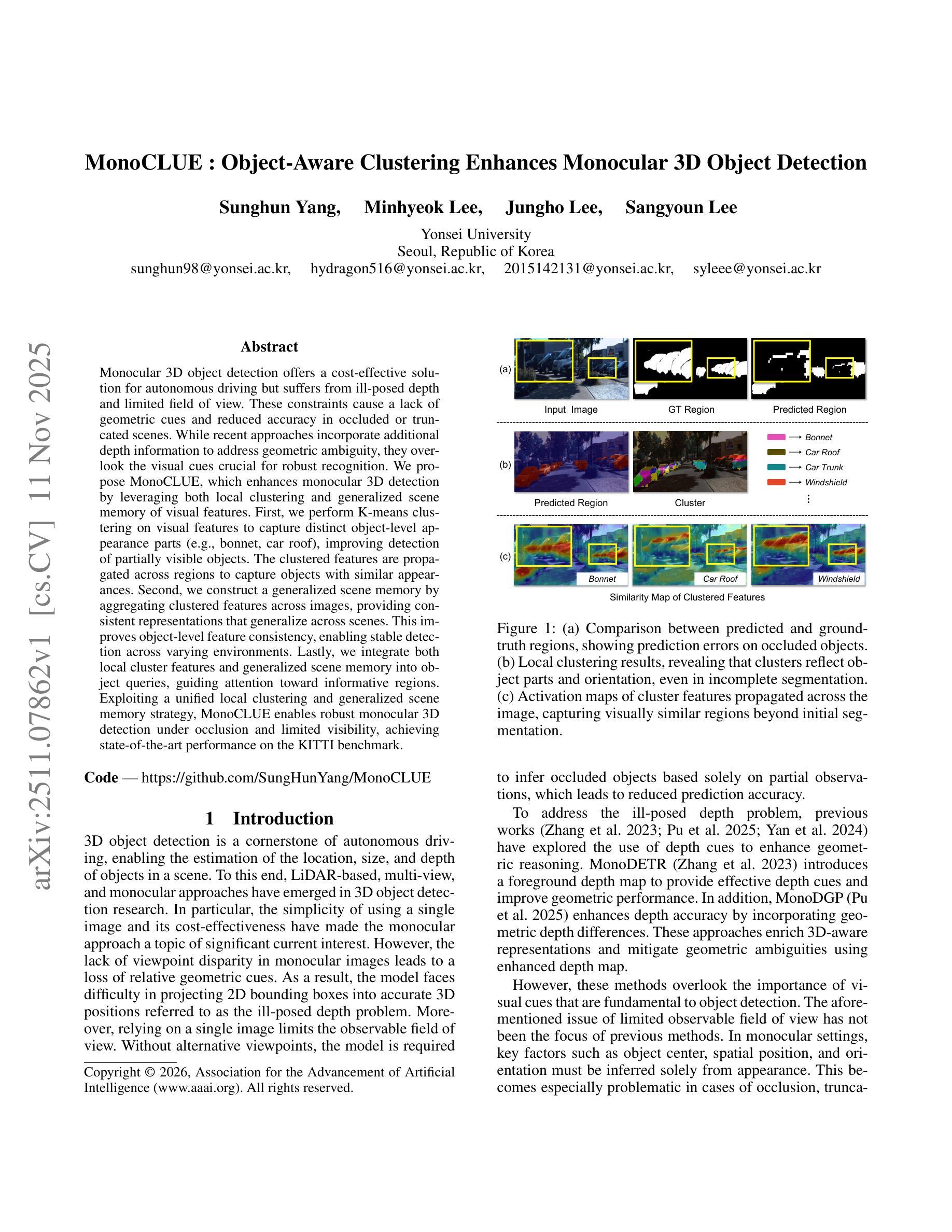 基于单目3D对象检测的自主驾驶成本效益解决方案,因深度模糊及视野受限存在几何线索缺失及遮挡或截断场景精度下降问题。近期方法虽融入深度信息解决几何歧义,但忽略了关键视觉线索的稳健识别。本文提出MonoCLUE,通过结合局部聚类和广义场景记忆强化单目3D检测。首先,对视觉特征进行K-means聚类,捕捉独特的对象级外观部分(如引擎盖、车顶),改进部分可见对象的检测。聚类特征跨区域传播以捕捉具有相似外观的对象。其次,通过聚集图像中的聚类特征构建广义场景记忆,提供跨场景的通用表示。这提高了对象级别的特征一致性,实现了不同环境下的稳定检测。最后,将局部聚类特征和广义场景记忆整合到对象查询中,引导注意力关注信息区域。借助统一的局部聚类和广义场景记忆策略,MonoCLUE在遮挡和有限可见度下实现了稳健的单目3D检测,在KITTI基准测试中达到最新性能。