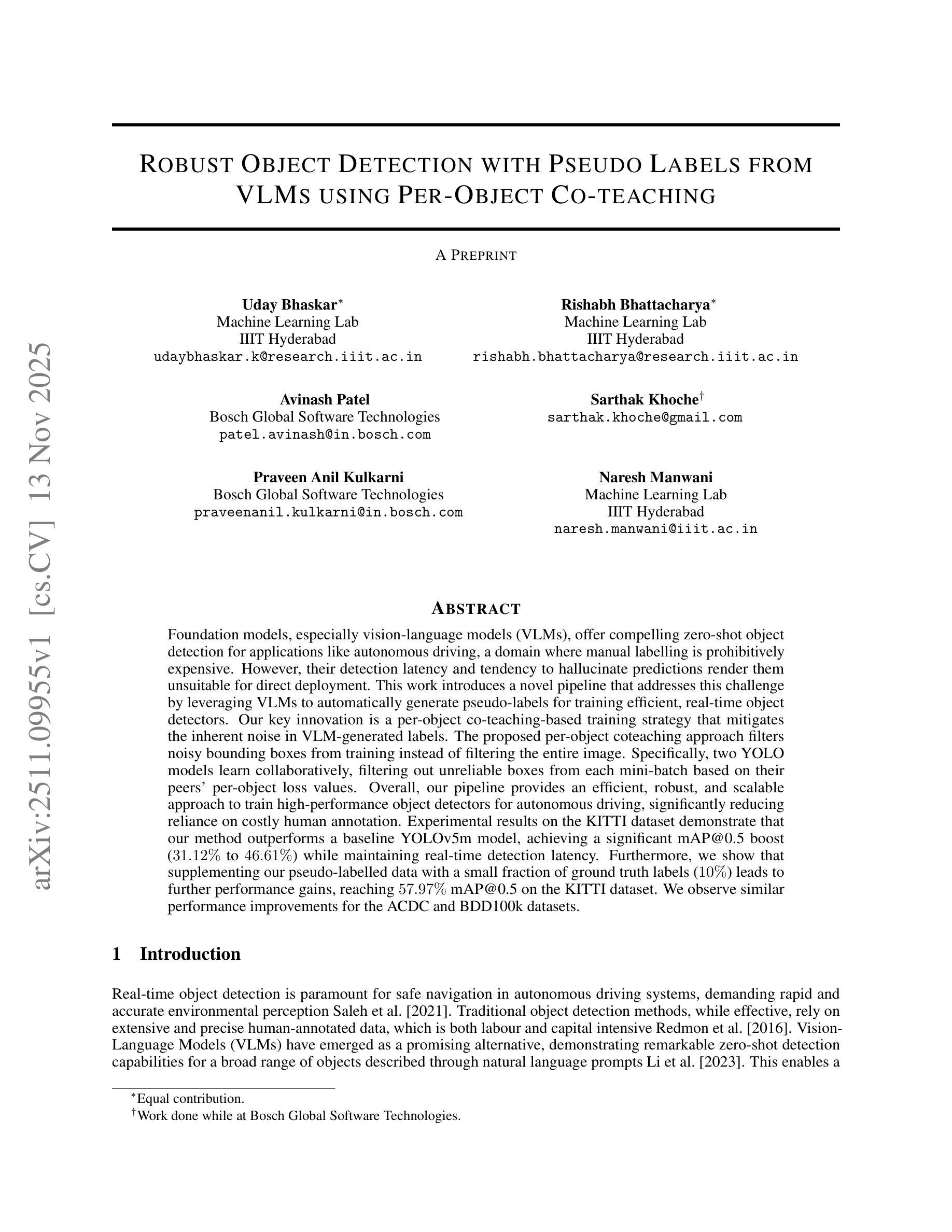 本文提出一种利用视觉语言模型(VLMs)自动生成伪标签,训练高效实时目标检测器的新颖流程。通过采用基于目标协同教学的训练策略,减轻VLM生成标签的固有噪声问题。该策略能够过滤掉训练中的不可靠边界框,而非过滤整个图像。在KITTI数据集上的实验表明,该方法相较于基线YOLOv5m模型显著提升mAP@0.5指标,从31.12%提升至46.61%,同时保持实时检测速度。通过补充小部分真实标签数据(仅占10%),性能可进一步提升至57.97%。该流程为自动驾驶领域高效、稳健、可扩展的目标检测器训练提供了有效方法。