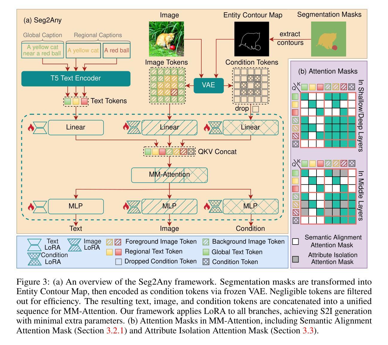 尽管扩散模型最近有进展,但顶尖的文生图(T2I)模型仍然难以实现对精确空间布局的控制,即准确生成具有指定属性和位置的实体。掩膜到图像(S2I)的生成方法通过融入像素级空间指导和区域文本提示,已成为一种有前途的解决方案。然而,现有的S2I方法无法同时确保语义一致性和形状一致性。为了应对这些挑战,我们提出了Seg2Any,这是一种新型S2I框架,建立在先进的多模态扩散变压器(如FLUX)之上。首先,为了实现语义和形状的一致性,我们将分割掩膜条件分解为区域语义和高频形状组件。通过语义对齐注意力掩膜引入区域语义条件,确保生成的实体符合其分配到的文本提示。代表实体边界的高频形状条件被编码为实体轮廓图,然后作为多模态注意力的一种额外模态引入,以指导图像的空间结构。其次,为了防止多实体场景中属性在实体之间的泄露,我们引入了属性隔离注意力掩膜机制,该机制约束每个实体的图像令牌在图像自注意力期间只专注于自身。为了支持开放集S2I生成,我们构建了SACap-1M,这是一个包含100万张图像、590万个分割实体和详细区域描述的大规模数据集,以及用于全面S2I评价的SACap-Eval基准测试。大量实验表明,Seg2Any在开放集和封闭集的S2I基准测试中均达到了最先进的性能,尤其是在实体的精细粒度空间和属性控制方面。