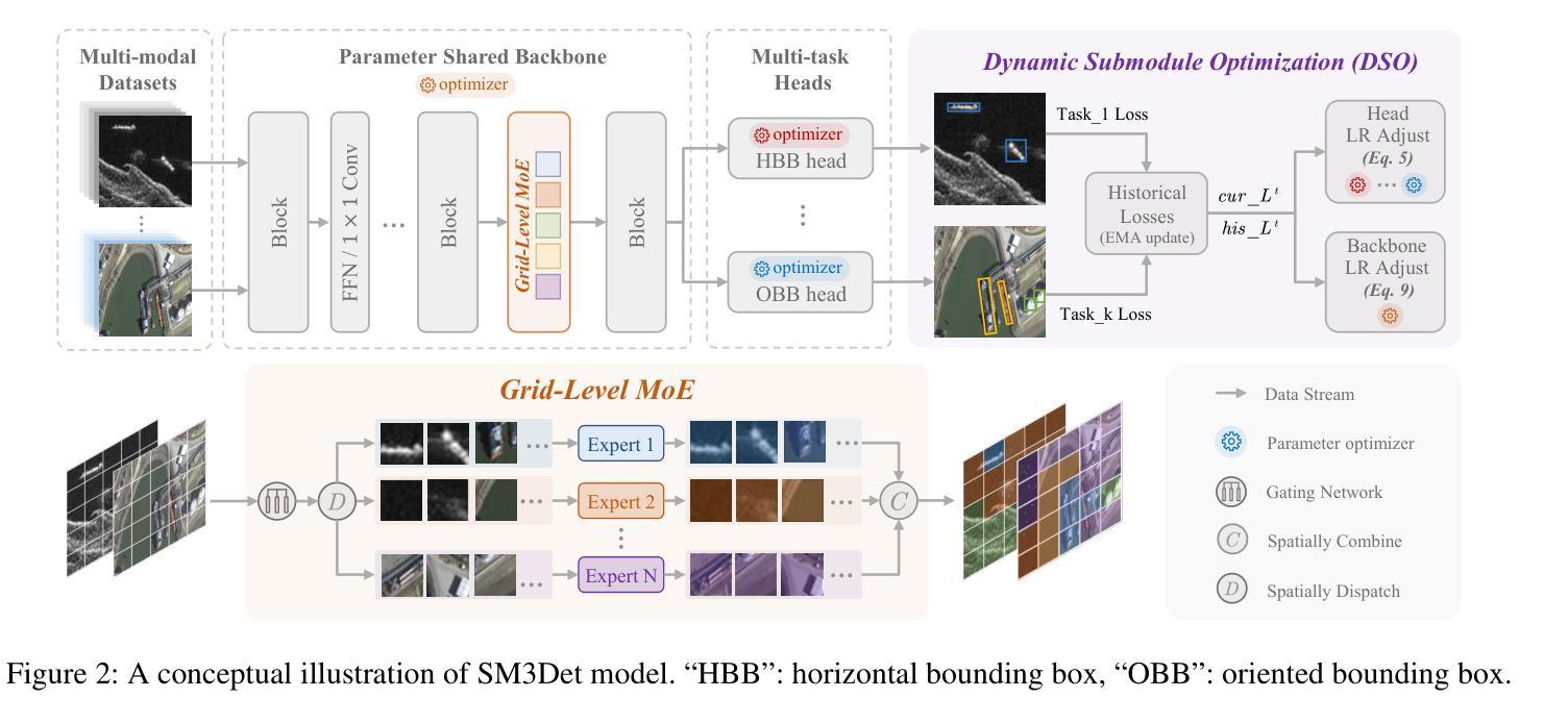 随着遥感技术的快速发展,高分辨率多模态图像现在更加易于获取。传统的目标检测模型是在单一数据集上进行训练的,通常局限于特定的成像模式和注释格式。然而,这种方法忽略了多模态之间宝贵的知识共享,并限制了模型在更通用场景中的应用。本文引入了一个名为遥感多模态数据集和多任务目标检测(M2Det)的新任务,旨在从任何传感器模态准确检测水平或定向目标。这项任务由于1)涉及多模态建模的权衡和2)多任务优化的复杂性而具有挑战性。为了解决这些问题,我们建立了一个基准数据集,并提出了一种统一模型SM3Det(用于多模态数据集和多任务目标检测的单模型)。SM3Det利用网格级稀疏MoE骨干网,实现联合知识学习,同时保留不同模态的独特特征表示。此外,它采用一致性同步优化策略,通过动态调整学习率,能够有效处理不同模态和任务之间不同程度的学习难度。大量实验证明了SM3Det的有效性和通用性,在单个数据集上始终优于专业模型。相关代码可通过https://github.com/zcablii/SM3Det获取。