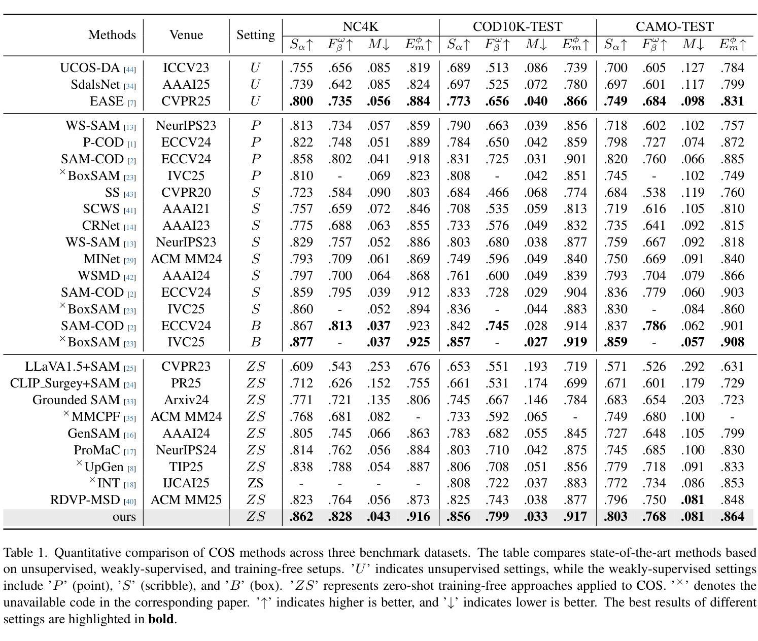 - 训练-free Camouflaged Object Segmentation (COS)方法通过自动生成视觉提示引导Segment Anything Model (SAM),无需特定任务训练。