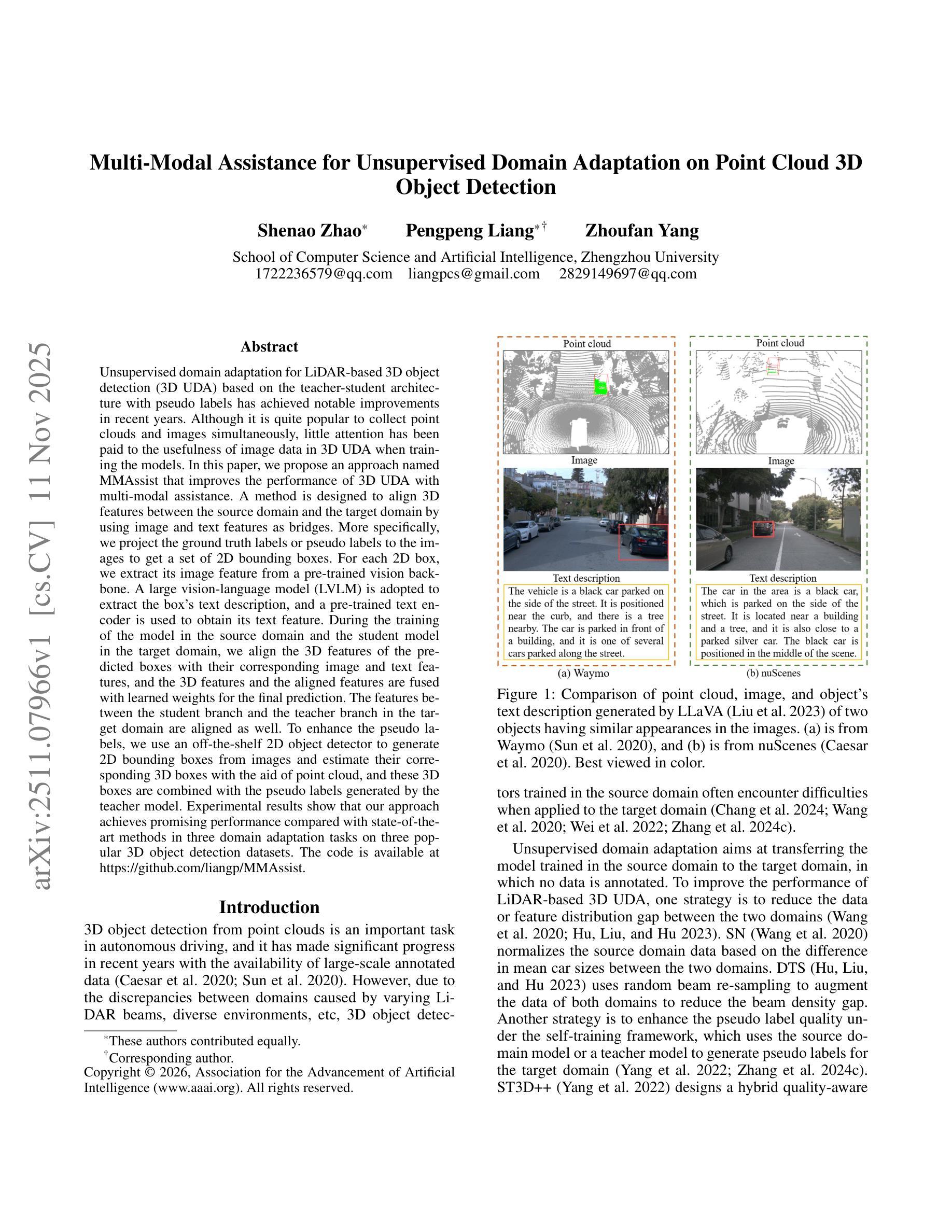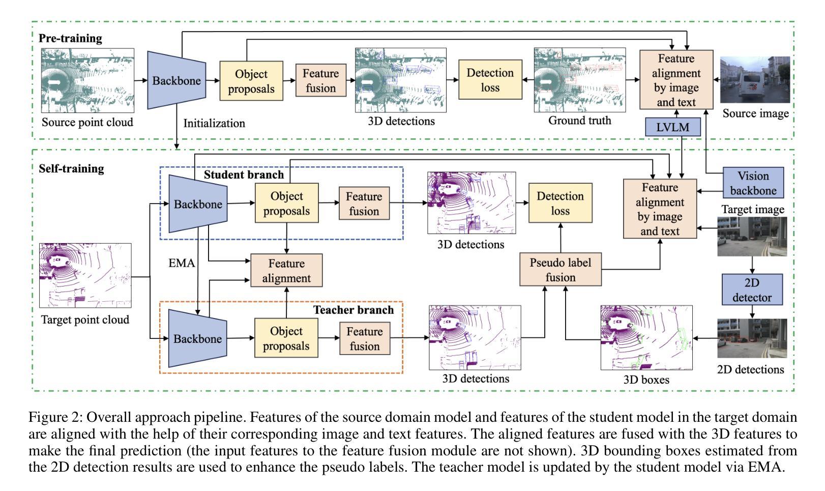 基于带有伪标签的教师-学生架构的激光雷达(LiDAR)的基于域适应的3D目标检测(也称为基于图像与文字特征的辅助学习LiDAR 3D目标检测)在近年来取得了显著的改进。虽然同时收集点云和图像是非常流行的做法,但在训练模型时,对于利用图像数据在无人监督领域适应中(也即三维UDA)的实际用处却没有引起足够的关注。本文提出了一种名为MMAssist的方法,通过多模态辅助提高了三维UDA的性能。设计了一种方法,利用图像和文字特征作为桥梁,对齐源域和目标域之间的三维特征。具体来说,我们将真实标签或伪标签投射到图像上得到一组二维边界框。对于每个二维框,我们从预训练的视觉骨干网络中提取其图像特征。使用大型视觉语言模型(LVLM)来提取框的文本描述,并使用预训练的文本编码器获取其文本特征。在源域训练模型和训练目标域的学生模型时,我们将预测框的三维特征与其对应的图像和文字特征对齐,并将三维特征和已对齐的特征融合用于最终预测。同时,目标域中的学生分支和教师分支之间的特征也被对齐。为了增强伪标签,我们使用现成的二维目标检测器从图像生成二维边界框,并利用点云估计其对应的三维框,并将这些三维框与由教师模型生成的伪标签结合使用。实验结果表明,与最先进的算法相比,我们的方法在三个领域适应任务中的三个流行的三维目标检测数据集上取得了有前景的表现。相关代码可从https://github.com/liangp/MMAssist获得。