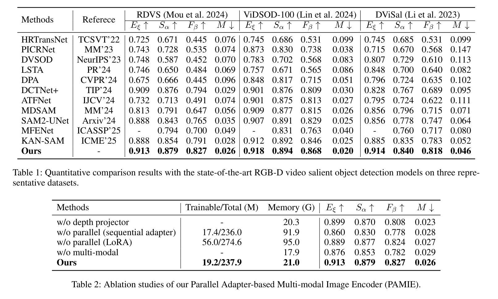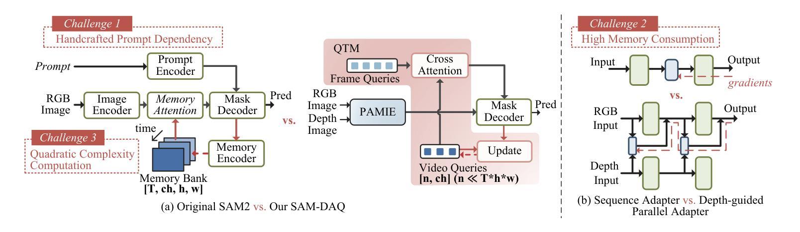 最近,分段任何事物模型(SAM)受到广泛关注,被视为通用分割的视觉基础模型。研究者尝试将其直接应用于RGB-D视频显著目标检测任务,但面临依赖手动提示、序贯适配器高内存消耗和内存注意力计算负担等三大挑战。为应对这些局限,我们提出一种名为SAM-DAQ的新方法,它通过深度引导自适应查询将SAM2适应于视频中的显著目标检测。首先,我们部署并行适配器多模态图像编码器(PAMIE),以跳过连接的方式融入多个深度引导并行适配器(DPAs)。值得注意是,我们在无提示条件下微调了冻结的SAM编码器,DPA利用深度线索促进多模态特征的融合。其次,我们引入查询驱动式临时内存模块(QTM),将内存银行和提示嵌入到可学习管道中。具体来说,通过同时利用帧级查询和视频级查询,QTM模块不仅可以选择性提取时间一致性特征,还可以迭代更新查询的时间表示。在三个RGB-D VSOD数据集上的大量实验表明,所提出的SAM-DAQ在所有评价指标上均优于最新方法。