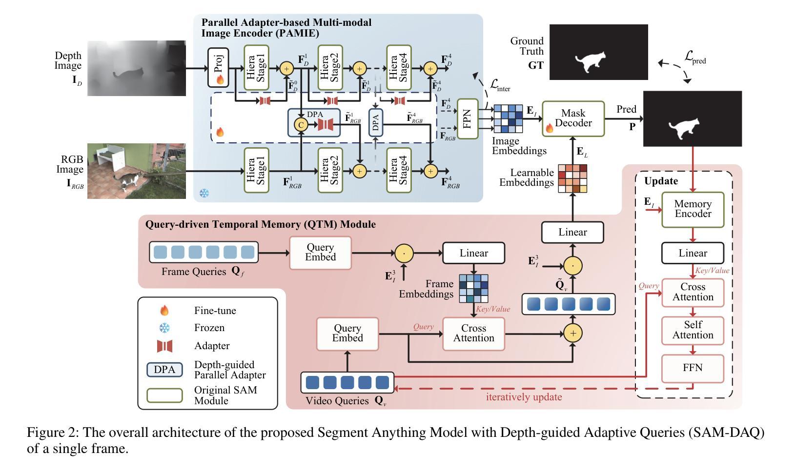 最近,任何内容分割模型(SAM)引起了广泛关注,通常被视为通用分割的视觉基础模型。一些研究人员尝试直接将基础模型应用于RGB-D视频显著目标检测(RGB-D VSOD)任务,这常常面临三个挑战,包括依赖手动提示、顺序适配器的高内存消耗,以及内存注意力的计算负担。为了解决这些限制,我们提出了一种新方法,即深度引导自适应查询的任意内容分割模型(SAM-DAQ),它将SAM2适应于从视频中弹出显著目标,通过在一个统一框架内无缝集成深度和时态线索。首先,我们部署了基于并行适配器的多模态图像编码器(PAMIE),它以跳过连接的方式结合了多个深度引导并行适配器(DPA)。值得注意的是,我们在无提示条件下对冻结的SAM编码器进行了微调,DPA利用深度线索来促进多模态特征的融合。其次,我们部署了一个查询驱动的时态内存(QTM)模块,它将内存银行和提示嵌入到一个可学习的流程中。具体来说,通过同时利用帧级查询和视频级查询,QTM模块不仅可以有选择地提取时态一致性特征,还可以迭代更新查询的时态表示。在三个RGB-D VSOD数据集上进行了大量实验,结果表明,所提出的SAM-DAQ在所有评估指标上均优于最先进的方法。