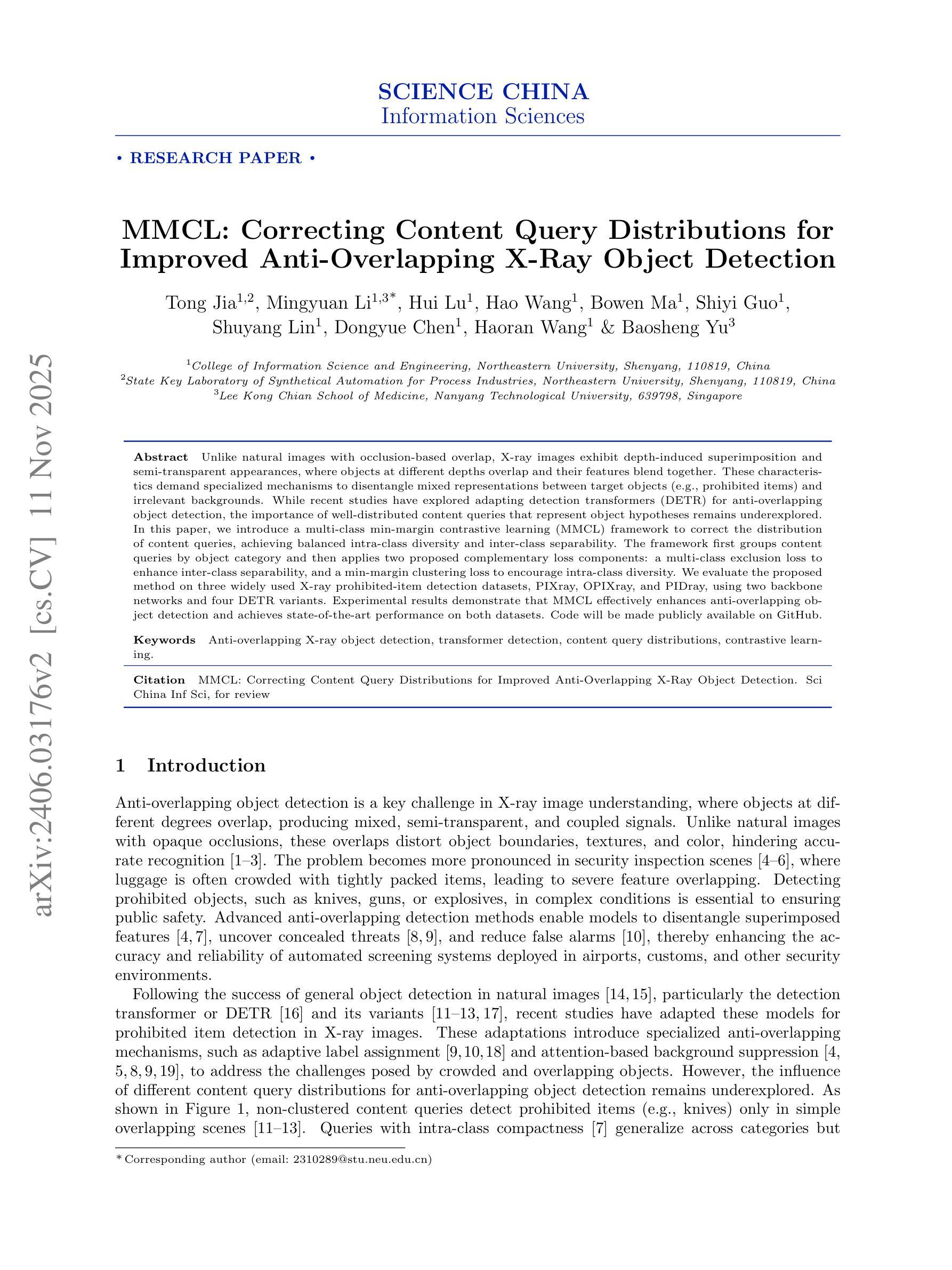 不同于基于遮挡重叠的自然图像,X射线图像表现出深度引起的叠加和半透明外观,不同深度的物体彼此重叠,其特征融合在一起。这些特点需要专门的机制来解开目标对象(如违禁物品)和无关背景之间的混合表示。虽然近期研究已经探索了检测变压器(DETR)在防重叠对象检测中的应用,但代表对象假设的分布式内容查询的重要性仍被忽视。在本文中,我们引入了一种多类最小间隔对比学习(MMCL)框架,以校正内容查询的分布,实现类内多样性平衡和类间可分性。该框架首先按对象类别对内容查询进行分组,然后应用两个提出的互补损失组件:多类排除损失,以增强类间可分性,和最小间隔聚类损失,以促进类内多样性。我们在三个广泛使用的X射线违禁物品检测数据集PIXray、OPIXray和PIDray上评估了所提出的方法,使用了两个主干网络和四个DETR变体。实验结果表明,MMCL有效地提高了防重叠对象检测性能,并在两个数据集上均达到了最先进的性能。代码将在GitHub上公开提供。