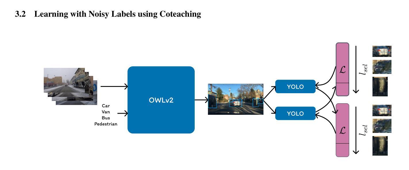 基础模型,特别是视觉语言模型(VLMs),为自动驾驶等应用提供了引人注目的零射击目标检测功能,这是一个手动标签成本过高的领域。然而,它们的检测延迟和倾向于产生幻觉预测使其不适合直接部署。这项工作引入了一种新管道来解决这一挑战,利用VLMs自动生成伪标签来训练高效的实时目标检测器。我们的关键创新之处在于基于每个对象的协同教学训练策略,这减轻了VLM生成的标签中的固有噪声。所提出的针对每个对象的协同教学方法从训练中过滤出嘈杂的边界框,而不是过滤整个图像。具体来说,两个YOLO模型通过协作学习,基于同行之间的每个对象的损失值,从每个小批量数据中筛选出不可靠的框。总的来说,我们的管道提供了一种高效、稳健和可扩展的方法来训练用于自动驾驶的高性能目标检测器,大大降低了对昂贵的人力标注的依赖。在KITTI数据集上的实验结果表明,我们的方法优于基线YOLOv5m模型,在保持实时检测延迟的同时,实现了显著的mAP@0.5提升(从31.12%提高到46.61%)。此外,我们还表明,用一小部分真实标签(10%)补充我们的伪标签数据可以带来进一步的性能提升,在KITTI数据集上达到57.97%的mAP@0.5。我们在ACDC和BDD100k数据集上也观察到了类似的性能提升。