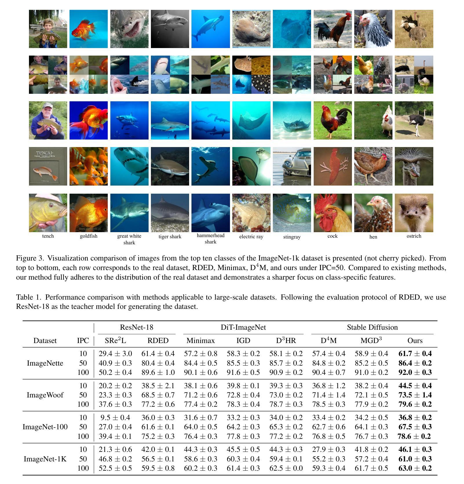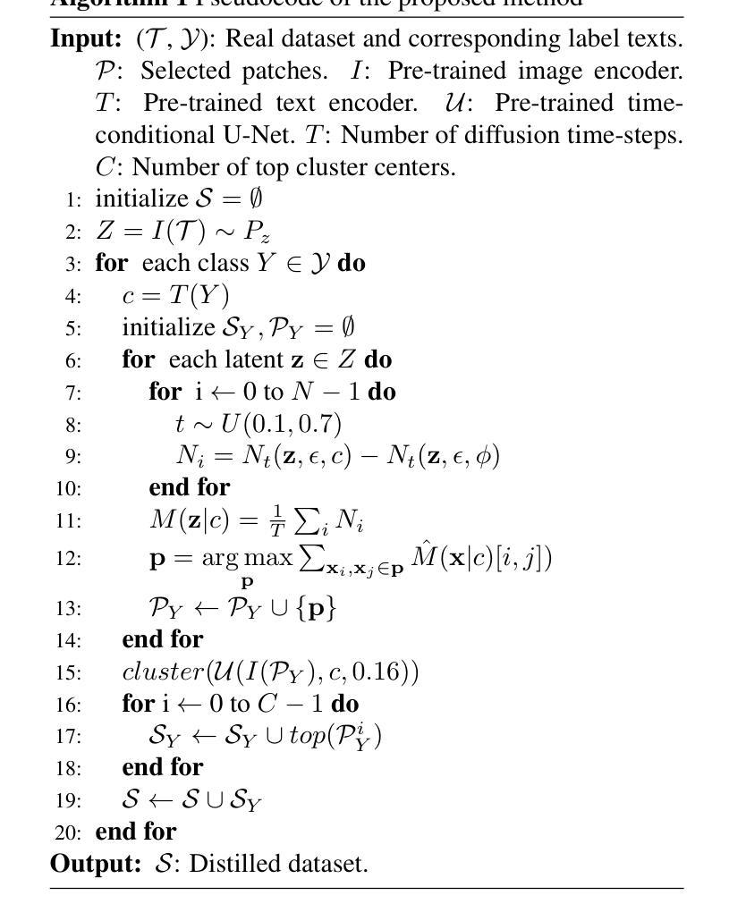 数据集蒸馏提供了一种通过优化紧凑数据集来减少内存和计算成本的有效方法,该数据集的性能可与原始完整数据集相当。然而,对于大规模数据集和复杂深度网络(例如,使用ResNet-101的ImageNet-1K),巨大的优化空间阻碍了蒸馏的有效性,限制了实际应用。最近的方法利用预训练的扩散模型直接生成信息图像,从而绕过像素级优化,并取得了有前景的结果。然而,这些方法经常遭受预训练扩散先验和目标数据集之间的分布偏移问题,以及在不同设置下需要多次蒸馏步骤的困扰。为了克服这些挑战,我们提出了一种新的框架,该框架与现有的基于扩散的蒸馏技术正交,利用扩散先验进行补丁选择而不是生成。我们的方法根据输入图像和可选的文本提示(带有或不带标签信息)预测扩散模型中的噪声,并计算每个图像-补丁对的损失。基于损失差异,我们可以识别原始图像中的独特区域。此外,我们对选定的补丁进行类内聚类和排名,以实施多样性约束。这种简化的管道可实现一步蒸馏过程。大量实验表明,我们的方法在各种指标和设置下始终优于最先进的方法。