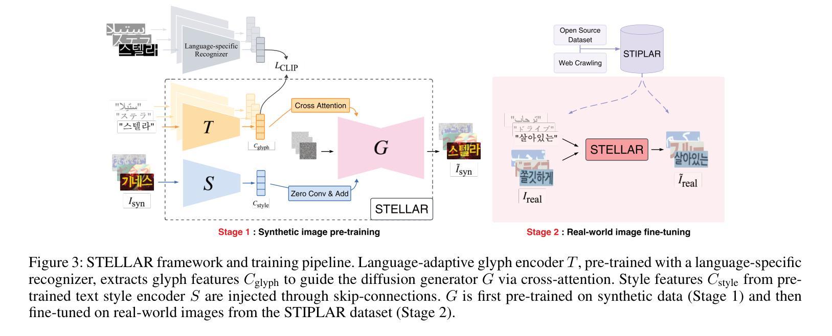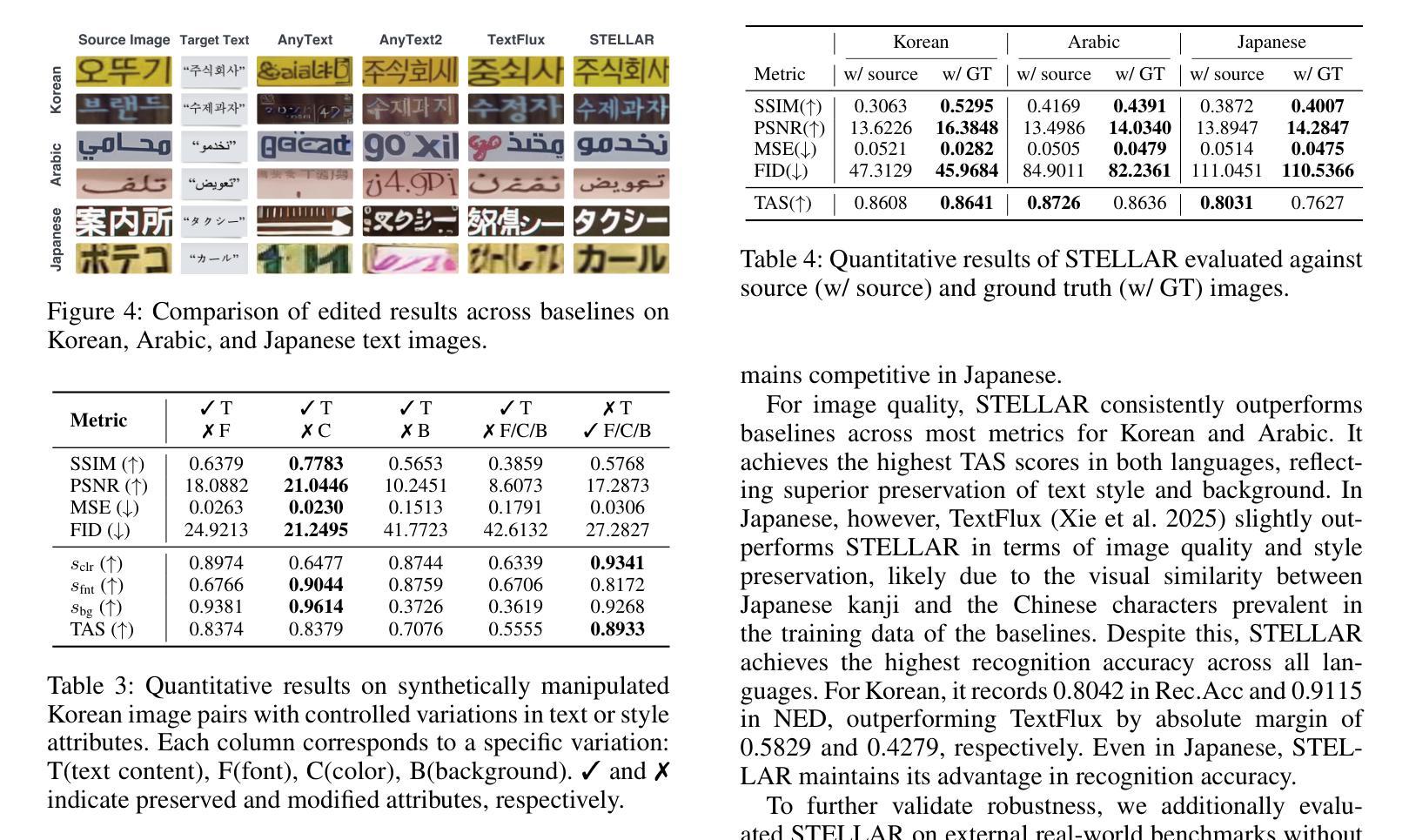 场景文本编辑(STE)的任务是在保持图像视觉风格(如字体、颜色和背景)的同时修改图像中的文本内容。虽然最近的扩散方法在提高视觉质量方面取得了进展,但仍存在关键限制:不支持低资源语言、合成数据和真实数据之间的领域差距,以及缺乏评估文本风格保持情况的合适指标。为了解决这些挑战,我们提出了STELLAR(场景文本编辑器,适用于低资源语言和真实世界数据)。STELLAR通过语言自适应的符号编码器以及分阶段训练策略,实现在合成数据上先进行预训练,再在真实图像上进行微调,从而实现可靠的多语言编辑。我们还构建了用于训练和评估的新数据集STIPLAR(场景文本图像对低资源语言和真实世界数据)。此外,我们提出了文本外观相似性(TAS),这是一种新的指标,通过独立测量字体、颜色和背景相似性来评估风格保持情况,即使在缺乏真实值的情况下也能实现稳健评估。实验结果表明,STELLAR在视觉一致性和识别准确性方面优于最先进模型,在语言基线的基础上平均提高了2.2%的TAS。