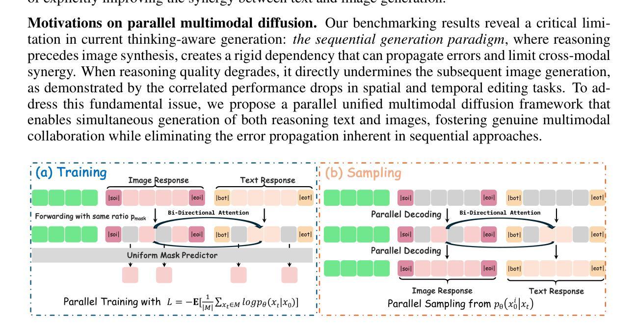 该文指出,虽然思考感知生成旨在提高复杂任务的性能,但现有序贯的自回归方法由于误差传递,会出现性能悖论性下降的问题。为解决这一问题,该文提出ParaBench基准测试,用以评估文本和图像输出模式。分析显示,性能下降与生成推理和最终图像之间的对齐不良密切相关。为解决此问题,该文提出并行多模态扩散框架MMaDA-Parallel,实现文本和图像在整个去噪轨迹中的持续双向交互。通过监督微调训练MMaDA-Parallel,并采用Parallel Reinforcement Learning(ParaRL)进一步优化,沿轨迹应用语义奖励以加强跨模态一致性。实验验证,该模型显著提高了跨模态对齐和语义一致性,在ParaBench上的输出对齐度较Bagel模型提高了6.9%,为思考感知图像合成建立了更稳健的范式。