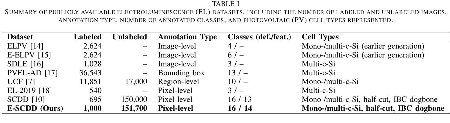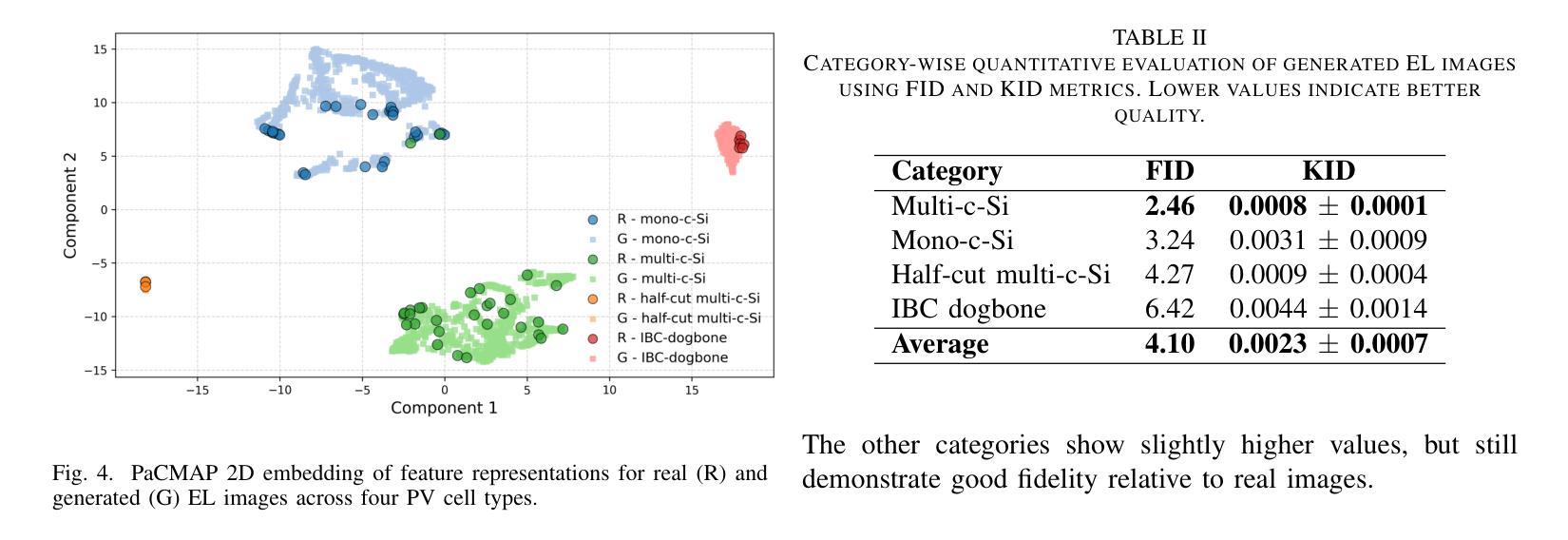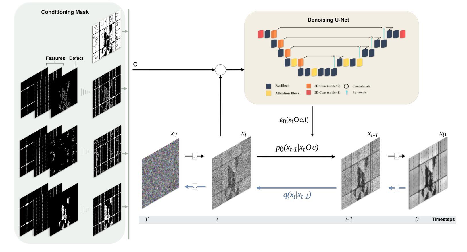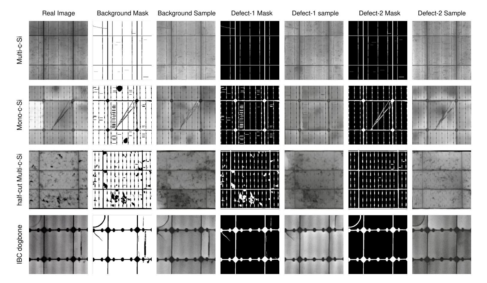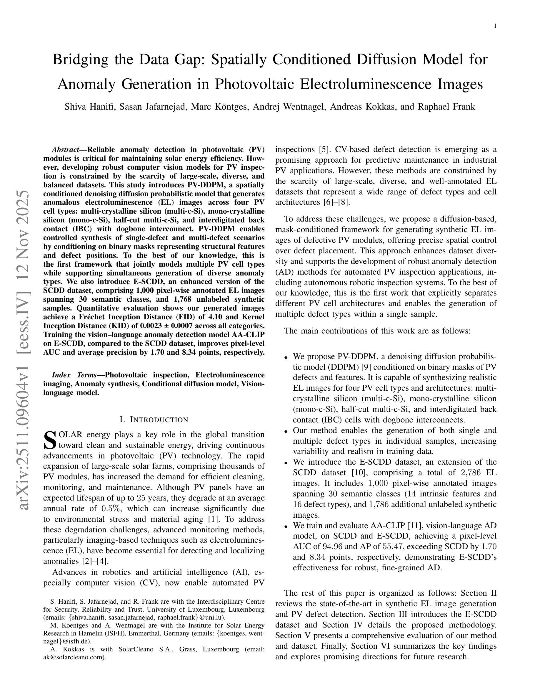 在光伏(PV)模块中进行可靠异常检测对于维持太阳能效率至关重要。然而,为PV检测开发稳健的计算机视觉模型受到大规模、多样且平衡数据集稀缺的限制。本研究介绍了PV-DDPM,这是一种空间条件去噪扩散概率模型,可生成四种光伏电池类型的异常电致发光(EL)图像:多晶硅(multi-c-Si)、单晶硅(mono-c-Si)、半切割多晶硅和具有dogbone互连的交叉背接触(IBC)。PV-DDPM通过以代表结构特征和缺陷位置的二进制蒙版为条件,实现了单缺陷和多缺陷场景的受控合成。据我们所知,这是一个首次联合建模多种光伏电池类型的同时支持多种异常类型生成的框架。我们还介绍了E-SCDD,这是SCDD数据集的增强版,包含1000张像素级注释的EL图像,跨越30个语义类别,以及1768个未标记的合成样本。定量评估表明,我们生成的图像在所有类别中的Fréchet Inception Distance(FID)达到4.10,Kernel Inception Distance(KID)为0.0023 ± 0.0007。在E-SCDD上训练视觉语言异常检测模型AA-CLIP与SCDD数据集相比,像素级AUC和平均精度分别提高了1.7点和8.34点。