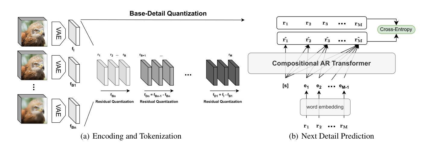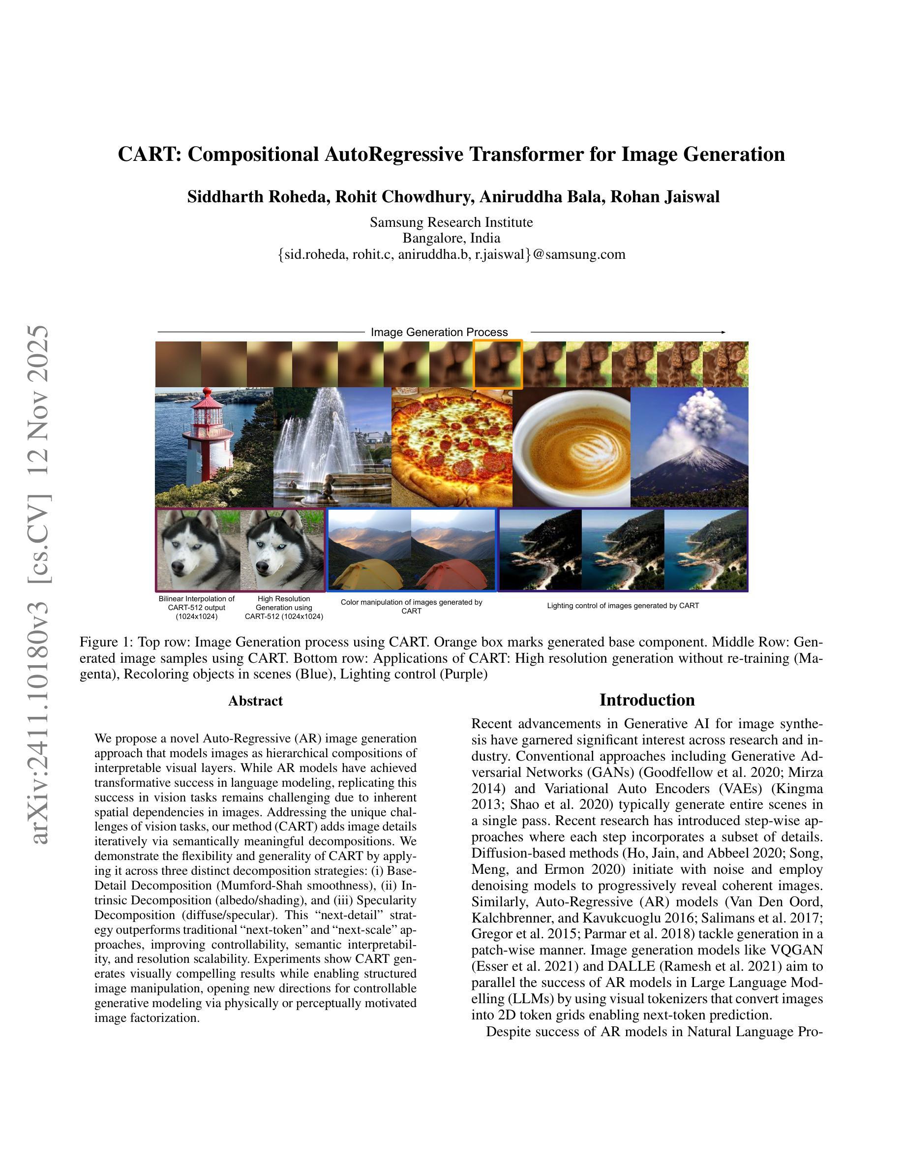 本文提出一种新颖的自回归(AR)图像生成方法,该方法将图像建模为可解释视觉层级的层次结构组合。尽管AR模型在语言建模中取得了突破性成功,但在视觉任务中复制这一成功仍然具有挑战性,因为图像中固有的空间依赖性。通过解决视觉任务的独特挑战,我们的方法(CART)通过语义有意义的分解迭代地添加图像细节。我们展示了CART在三种不同分解策略上的灵活性和通用性:(i)基础细节分解(Mumford-Shah平滑度),(ii)内在分解(亮度/阴影),以及(iii)光泽分解(漫射/光泽)。这种下一细节策略优于传统的下一令牌和下一尺度方法,提高了可控性、语义可解释性和分辨率可扩展性。实验表明,CART生成了视觉上引人注目的结果,同时实现了结构化图像操作,为通过物理或感知动机的图像分解进行可控生成建模开辟了新方向。