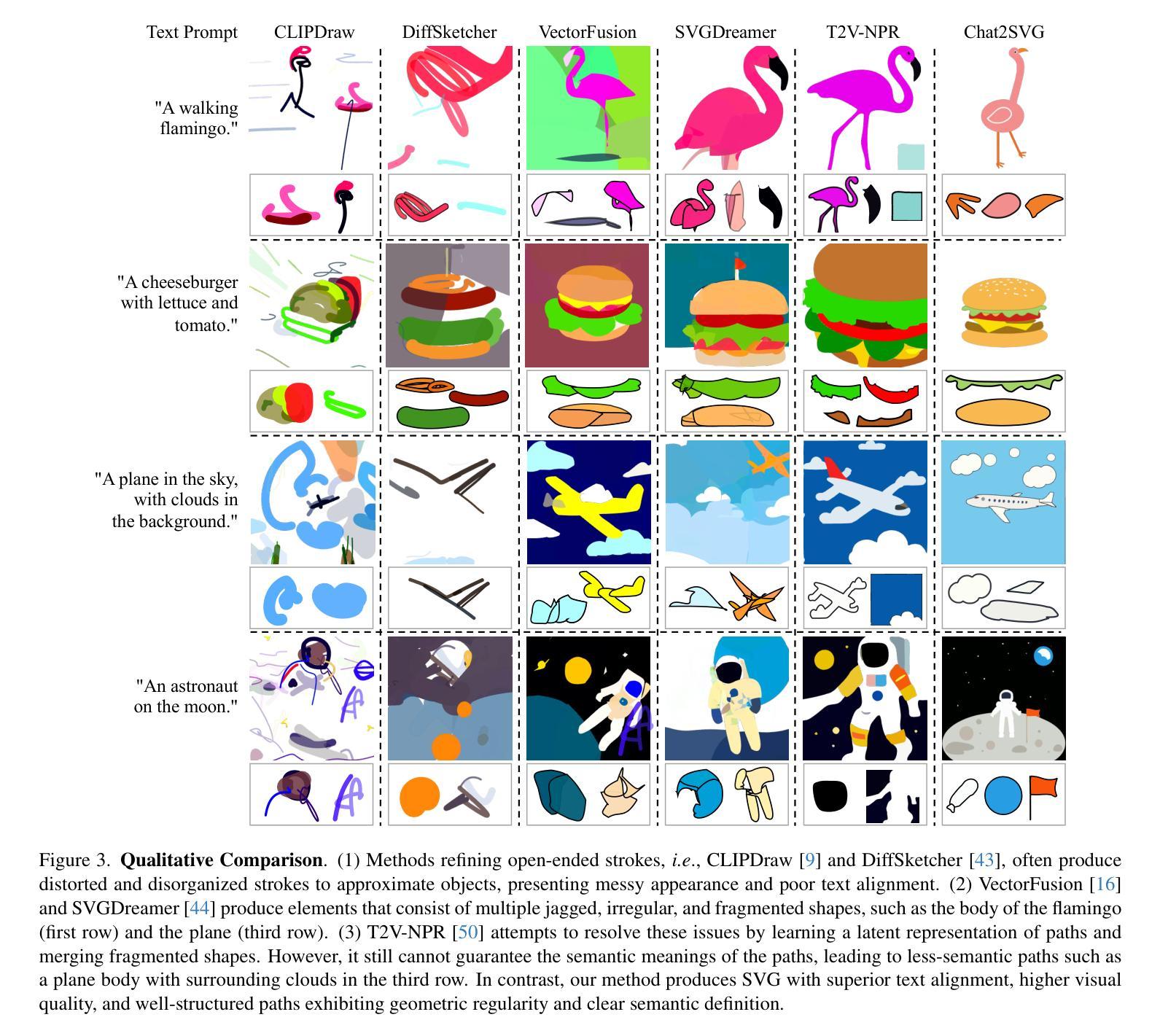 - Chat2SVG在视觉保真度、路径规律性和语义对齐方面表现优异。