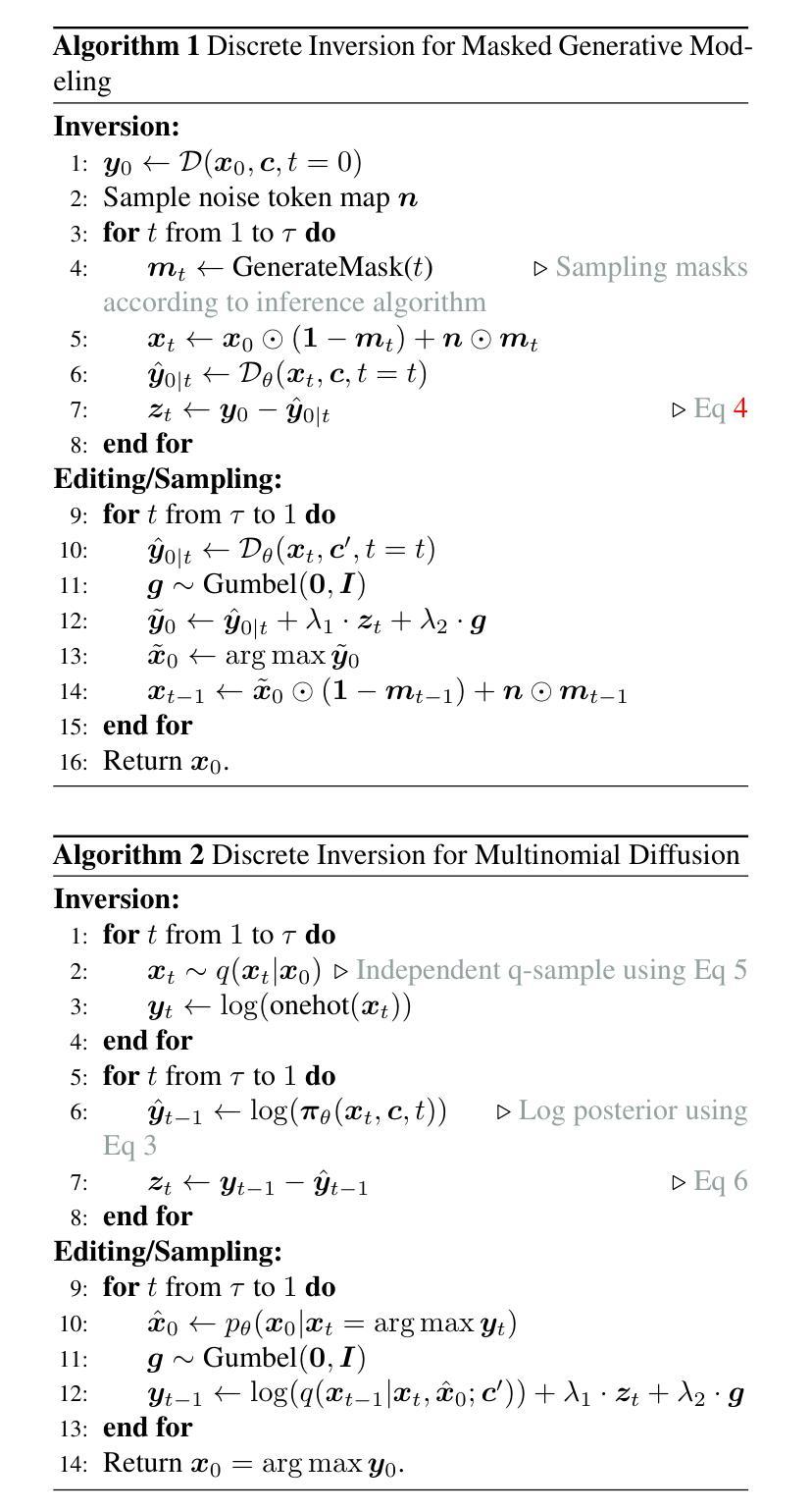 离散扩散模型在图像生成和掩码语言建模等任务中取得了成功,但在受控内容编辑方面存在局限性。我们引入了DICE(可控编辑的离散反转法),这是第一种为离散扩散模型实现精确反转的方法,包括多项式扩散和掩码生成模型。通过记录反向扩散过程中的噪声序列和掩码模式,DICE能够在不需要预先定义的掩码或注意力操纵的情况下,实现对离散数据的精确重构和灵活编辑。我们在图像和文本领域都展示了DICE的有效性,并在VQ-Diffusion、Paella和RoBERTa等模型上进行了评估。我们的结果表明,DICE在保持高数据保真度的同时,提高了编辑能力,为离散空间中的细粒度内容操作提供了新的机会。
