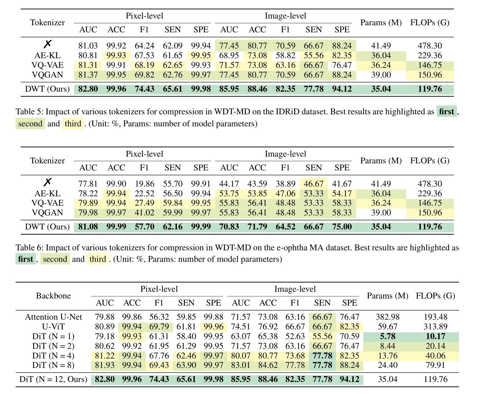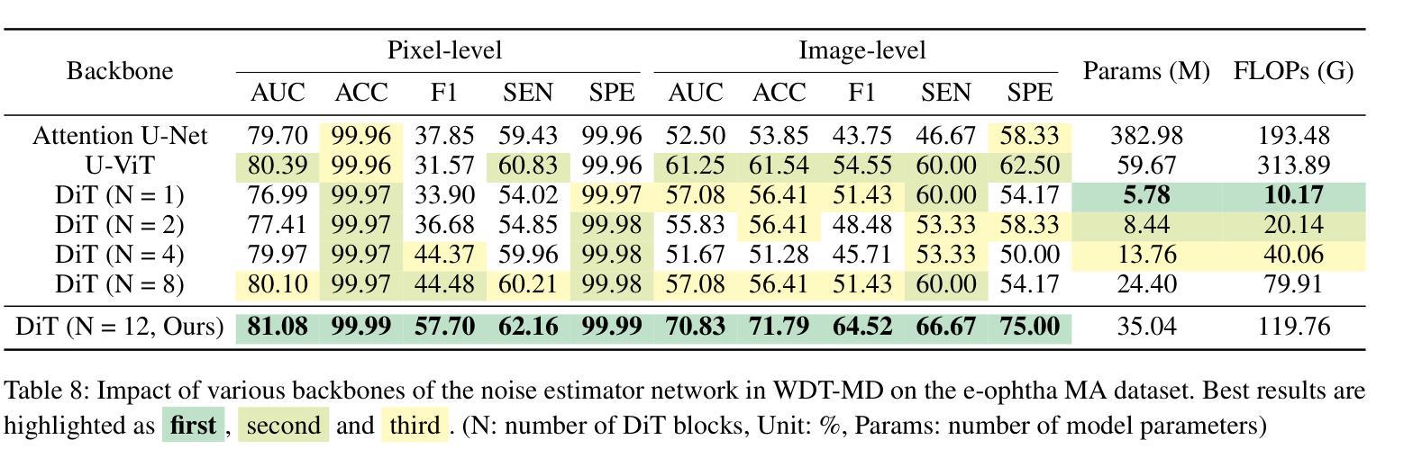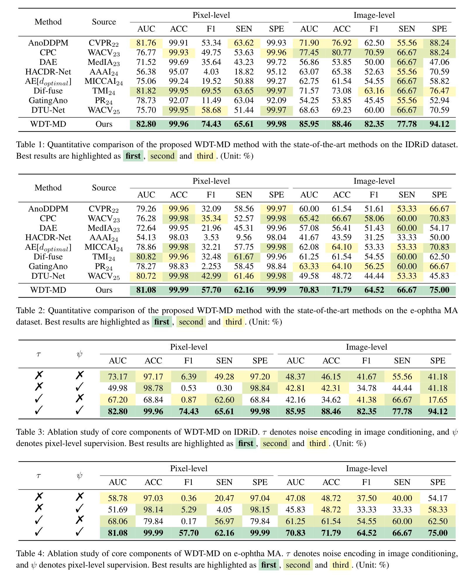 - 在IDRiD和e-ophtha数据集上的实验验证了WDT-MD在微动脉瘤检测中的优越性。