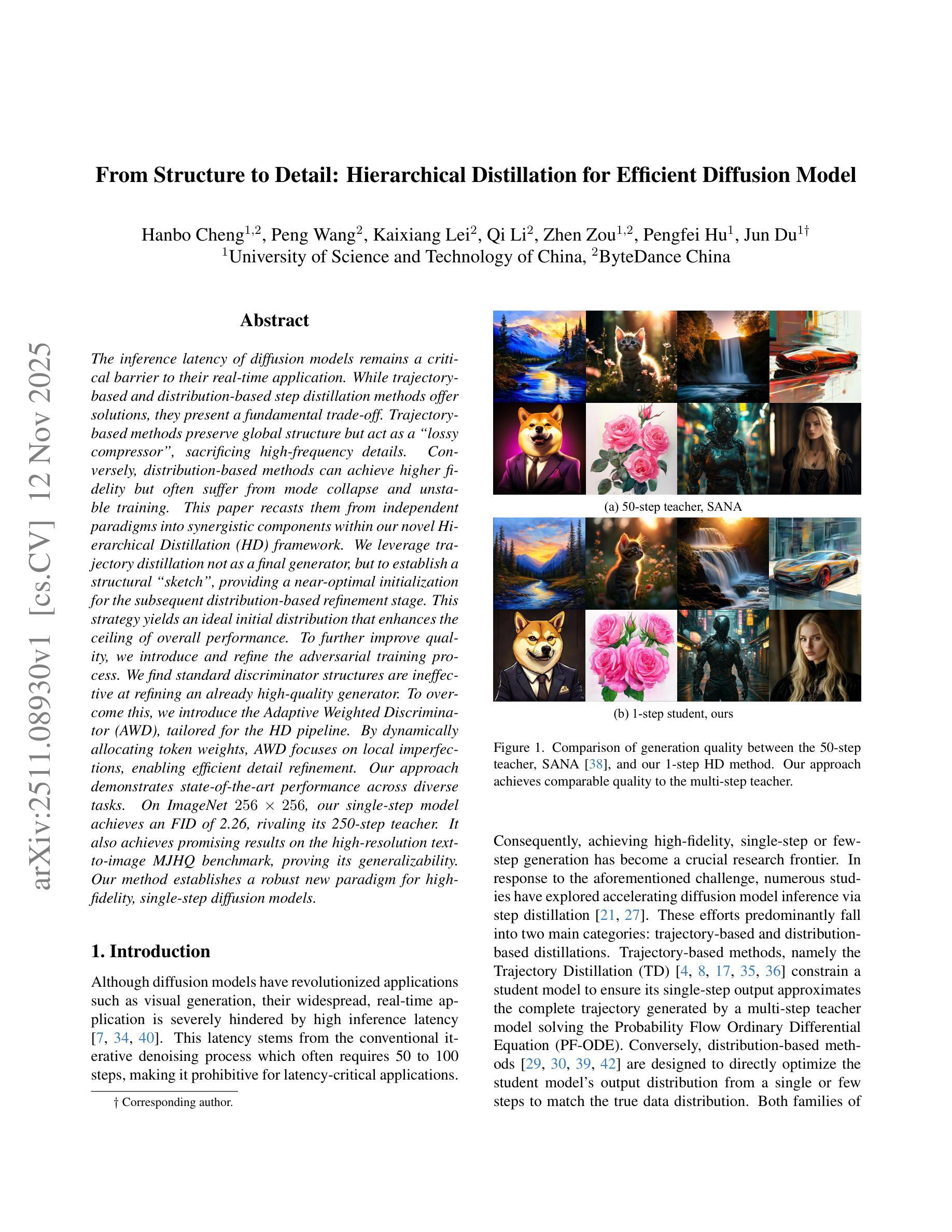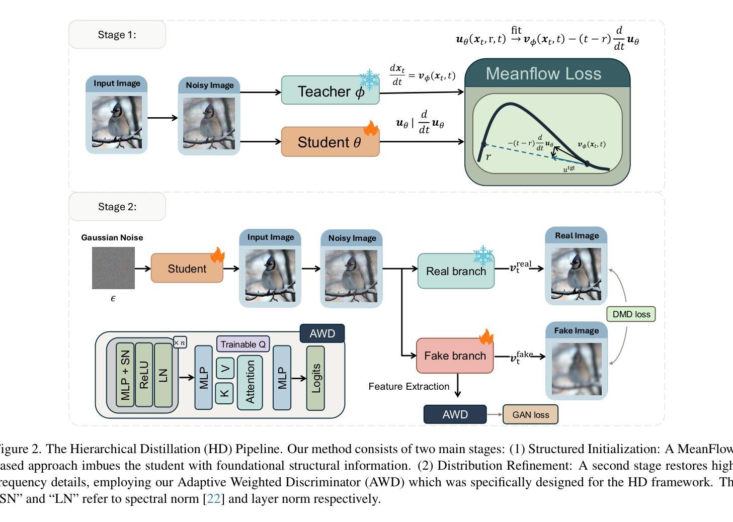扩散模型的推理延迟是其实时应用的关键障碍。虽然轨迹基础和分布基础的蒸馏方法提供了解决方案,但它们之间存在基本权衡。轨迹基础方法保留全局结构,但牺牲高频细节,作为“有损压缩器”。相反,分布基础方法可以达到高保真,但经常遭受模式崩溃和训练不稳定。本文将其从独立范式转变为我们新颖层次蒸馏(HD)框架内的协同组件。我们利用轨迹蒸馏并非作为最终生成器,而是建立结构性“草图”,为随后的分布基础细化阶段提供接近最优的初始化。此策略产生理想的初始分布,提高了整体性能的上限。进一步提高质量,我们对对抗训练过程进行了介绍和细化。我们发现标准鉴别器结构在细化已高质量生成器时无效。为了克服这一点,我们引入了自适应加权鉴别器(AWD),适用于HD管道。通过动态分配令牌权重,AWD专注于局部缺陷,实现有效的细节细化。我们的方法在多种任务上展示了卓越的性能。在ImageNet 256x256上,我们的单步模型实现了FID为2.26,与它的250步教师相抗衡。在高分辨率文本到图像的MJHQ基准测试中,它也取得了令人鼓舞的结果,证明了其泛化能力。我们的方法为高保真单步扩散模型建立了稳健的新范式。