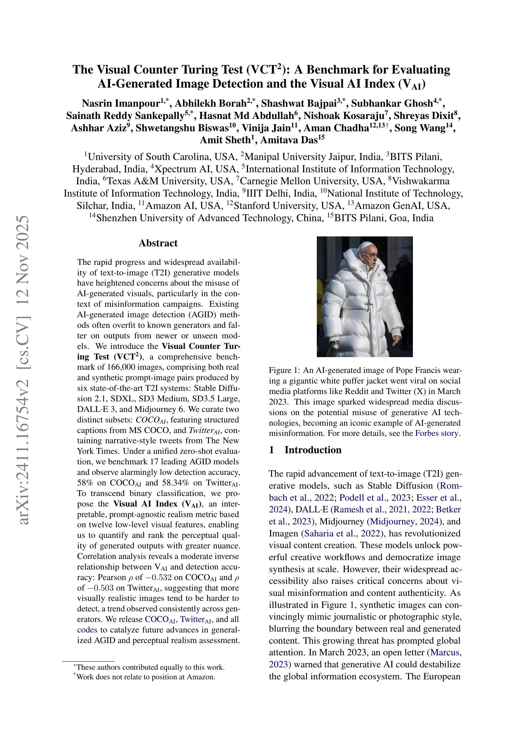 文本到图像(T2I)生成模型的快速进步和广泛可用性加剧了人们对人工智能生成图像误用的担忧,特别是在虚假信息泛滥的背景下。现有的AI生成图像检测(AGID)方法通常会对已知的生成器过度拟合,而在面对更新或未见过的模型输出时则表现不佳。我们引入了视觉反图灵测试(VCT2),这是一个包含16.6万张图像的综合基准测试,其中包括由六种最先进的T2I系统产生的真实和合成提示图像对:Stable Diffusion 2.1、SDXL、SD3 Medium、SD3.5 Large、DALL.E 3和Midjourney 6。我们创建了两个独特的子集:COCOAI,以MS COCO的结构化标题为特色,以及TwitterAI,包含《纽约时报》的叙事式推特。在统一的零样本评估下,我们对领先的17种AGID模型进行了基准测试,令人警惕的是,检测准确率极低,在COCOAI上为58%,在TwitterAI上为58.34%。为了超越二元分类,我们提出了视觉人工智能指数(VAI),这是一个基于十二个低级视觉特征的、可解释的、提示无关的逼真度指标,使我们能够更微妙地量化并排列生成输出的感知质量。相关性分析显示VAI与检测准确率之间存在适中的逆向关系:在COCOAI上的Pearson值为-0.532,在TwitterAI上为-0.503,这表明更逼真的图像往往更难检测,这一趋势在各大生成器中均持续存在。我们发布COCOAI、TwitterAI及所有代码,以推动未来在通用AGID和感知逼真度评估方面的进步。