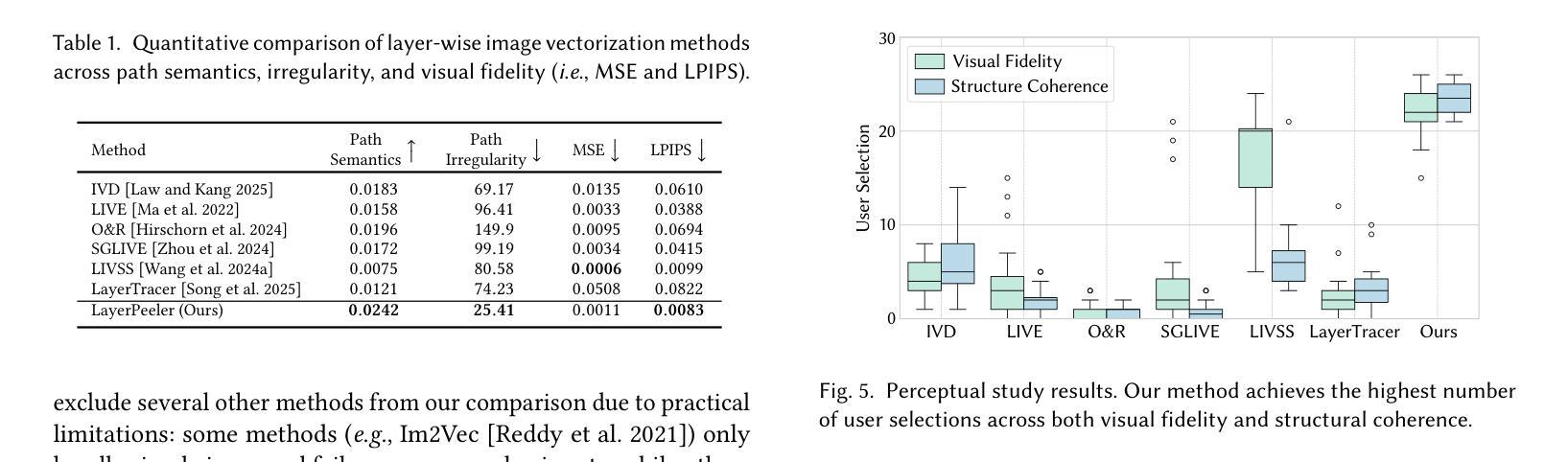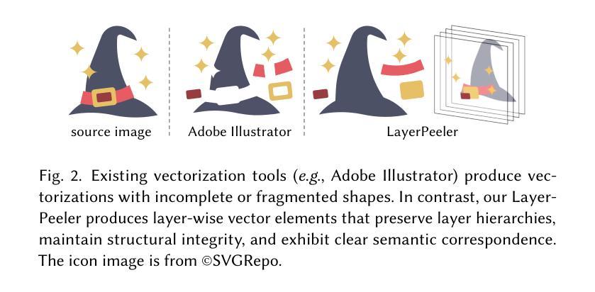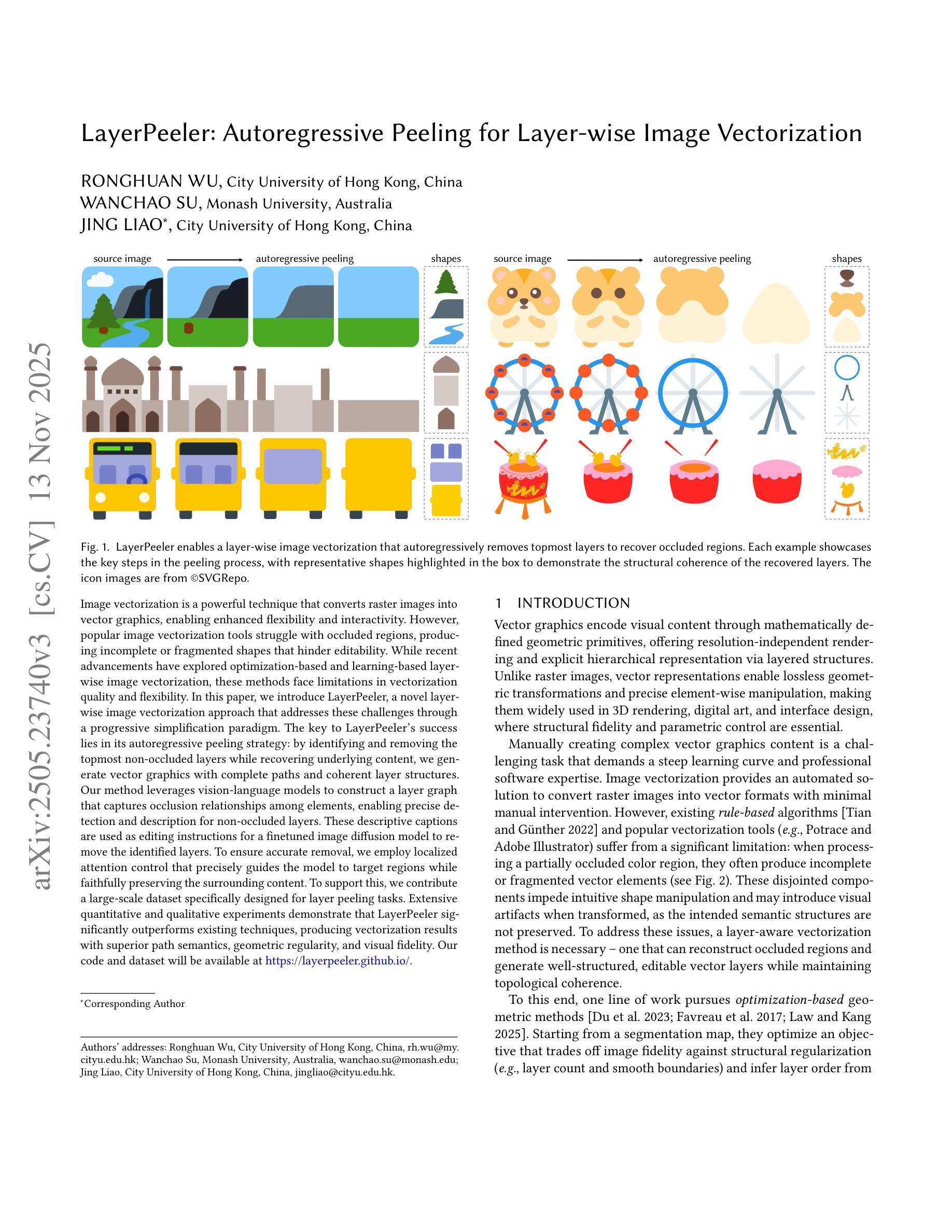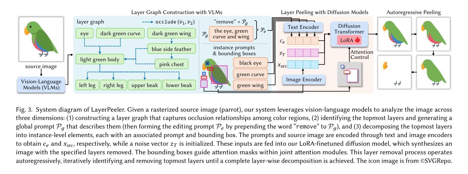 图像矢量化是一种强大的技术,能将位图图像转换为矢量图形,提高了灵活性和交互性。然而,流行的图像矢量化工具在处理遮挡区域时遇到困难,产生不完整或断裂的形状,妨碍了编辑能力。虽然最近的进展探索了基于优化和基于学习的分层图像矢量化,但这些方法在矢量化质量和灵活性方面仍面临局限。在本文中,我们介绍了LayerPeeler,这是一种新型的分层图像矢量化方法,通过渐进简化范式来解决这些挑战。LayerPeeler成功的关键在于其自回归剥离策略:通过识别和移除最顶部的非遮挡层并恢复底层内容,生成具有完整路径和连贯层结构的矢量图形。我们的方法利用视觉语言模型构建层图,捕捉元素之间的遮挡关系,为非遮挡层的精确检测和描述提供支持。这些描述性标题用作微调图像扩散模型的编辑指令,以移除已识别的层。为确保准确的移除,我们采用了局部注意力控制,精确引导模型定位区域,同时忠实保留周围内容。为此,我们贡献了一个专门为图层剥离任务设计的大规模数据集。大量的定量和定性实验表明,LayerPeeler在路径语义、几何规则性和视觉保真度方面显著优于现有技术,产生了出色的矢量化结果。