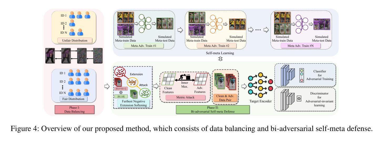 行人再识别(ReID)是许多现实世界应用(如行人轨迹跟踪)中的基本任务。然而,先进的基于深度学习的ReID模型很容易受到对抗性攻击的影响,其中行人图像的微小扰动可能导致完全错误的预测,从而构成重大安全威胁。虽然针对分类任务已经提出了许多对抗性防御策略,但它们扩展到度量学习任务(如行人ReID)仍然相对未被探索。而且,现有的针对行人ReID的几种防御方法未能解决对抗鲁棒ReID的固有独特挑战。在本文中,我们将对抗性防御在行人ReID中的挑战系统地归为两个关键问题:模型偏见和复合泛化要求。为了解决这些问题,我们提出了一个去偏双不变防御框架,该框架由两个阶段组成。在数据平衡阶段,我们使用基于扩散模型的数据重采样策略来缓解模型偏见,该策略促进训练数据的公平性和多样性。在双向对抗性自我元防御阶段,我们引入了一种新的度量对抗训练方法来克服由于缺乏分类器而导致的鲁棒性下降问题,该方法结合了最远负扩展软化技术。此外,我们还引入了对抗增强的自我元机制,以实现针对未见身份和未见攻击类型的双重泛化。实验表明,我们的方法显著优于现有的最先进的防御方法。