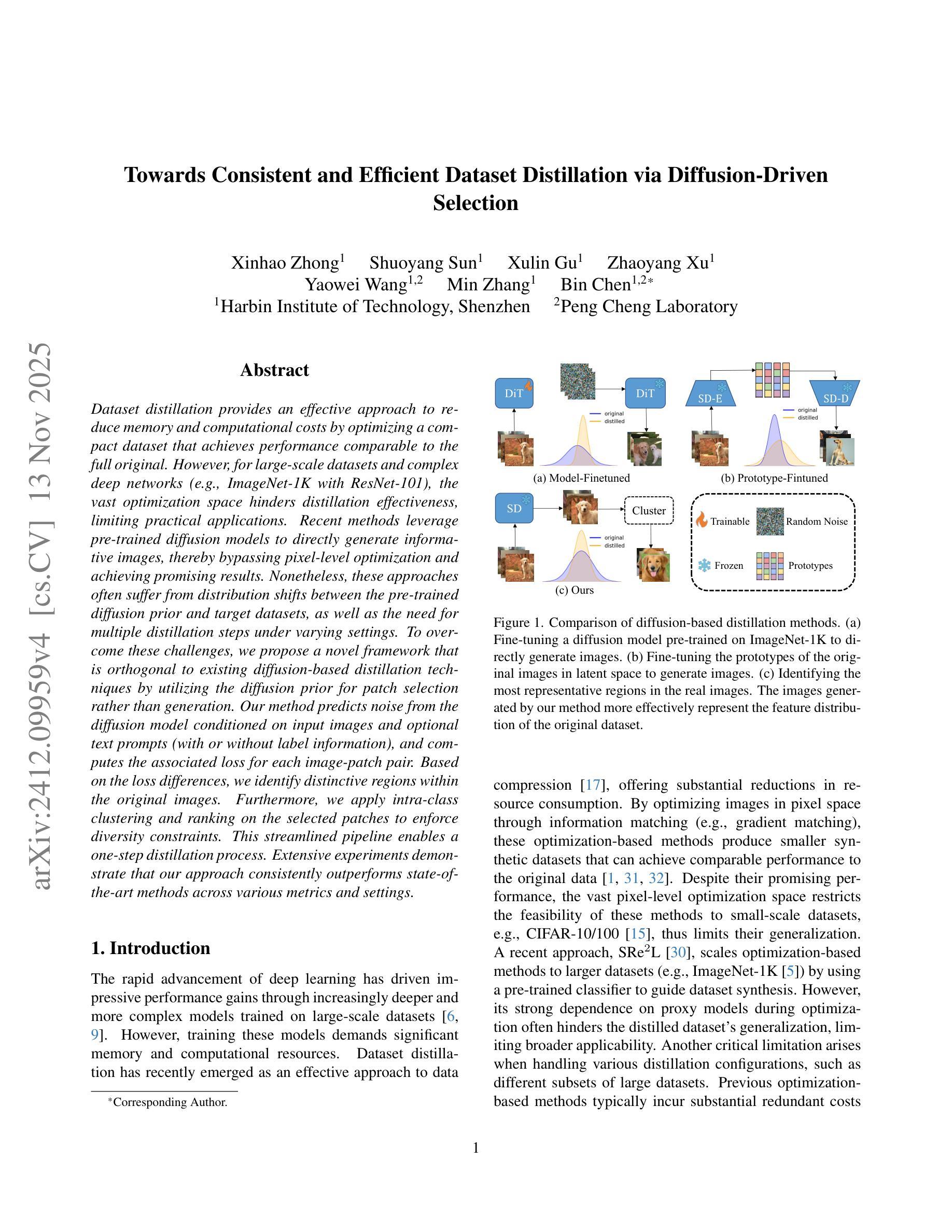 利用数据集蒸馏方法可以有效地降低内存和计算成本,通过优化紧凑数据集实现与原始数据集相当的性能。然而,对于大规模数据集和复杂深度网络(如ImageNet-1K与ResNet-101),巨大的优化空间阻碍了蒸馏效果,限制了实际应用。最近的方法利用预训练的扩散模型直接生成图像,从而绕过像素级优化,并获得了有前景的结果。然而,这些方法常常受到预训练扩散先验和目标数据集之间分布变化的困扰,以及需要在不同设置下进行多次蒸馏步骤。为了克服这些挑战,我们提出了一种新的框架,它与现有的基于扩散的蒸馏技术正交,利用扩散先验进行补丁选择而不是生成。我们的方法从扩散模型中预测给定输入图像和可选文本提示的噪声,并计算每个图像补丁对的损失。基于损失差异,我们确定了原始图像中的不同区域。此外,我们对所选补丁进行类内聚类和排名,以实施多样性约束。这一简化的管道实现了一次性蒸馏过程。大量实验表明,我们的方法在各种指标和设置下均优于现有先进方法。