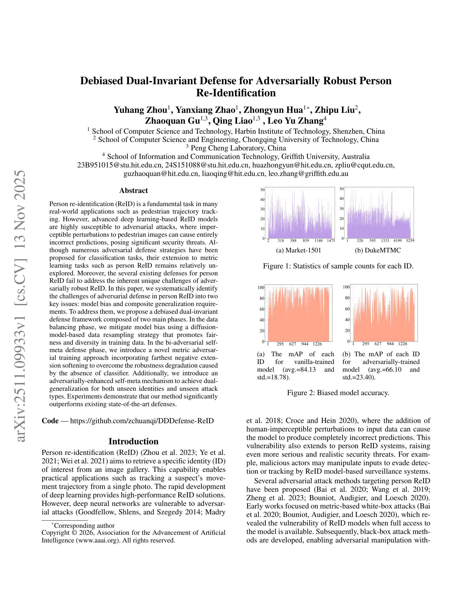 本文探讨了行人再识别(ReID)任务在面临对抗性攻击时的挑战,并提出了一个去偏双不变防御框架来解决这一问题。该框架包括数据平衡和双向对抗自元防御两个阶段。通过扩散模型进行数据重采样,促进训练的公平性和多样性,并引入了一种新的度量对抗训练方法来克服鲁棒性退化问题。实验证明,该方法显著优于现有最先进的防御手段。