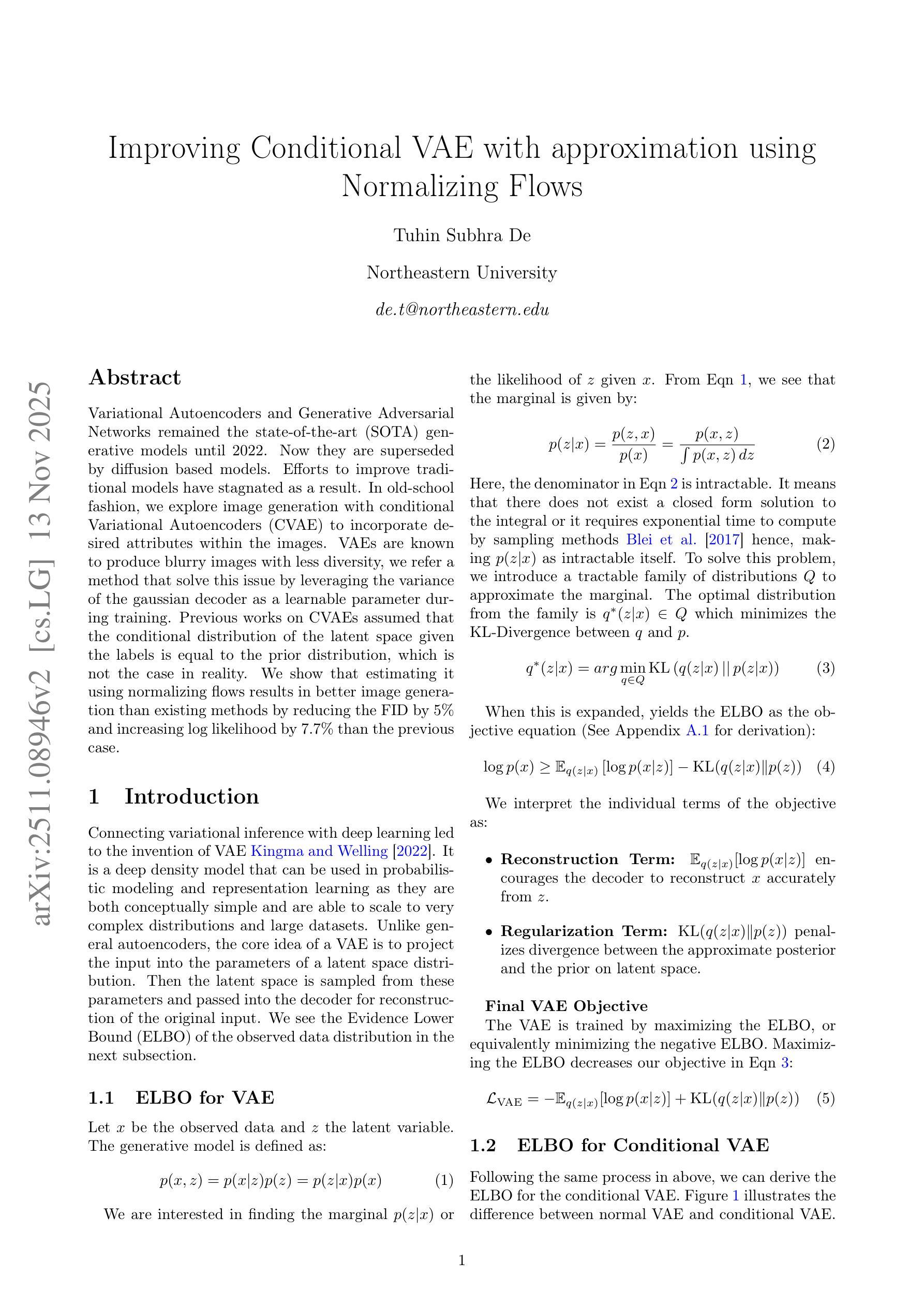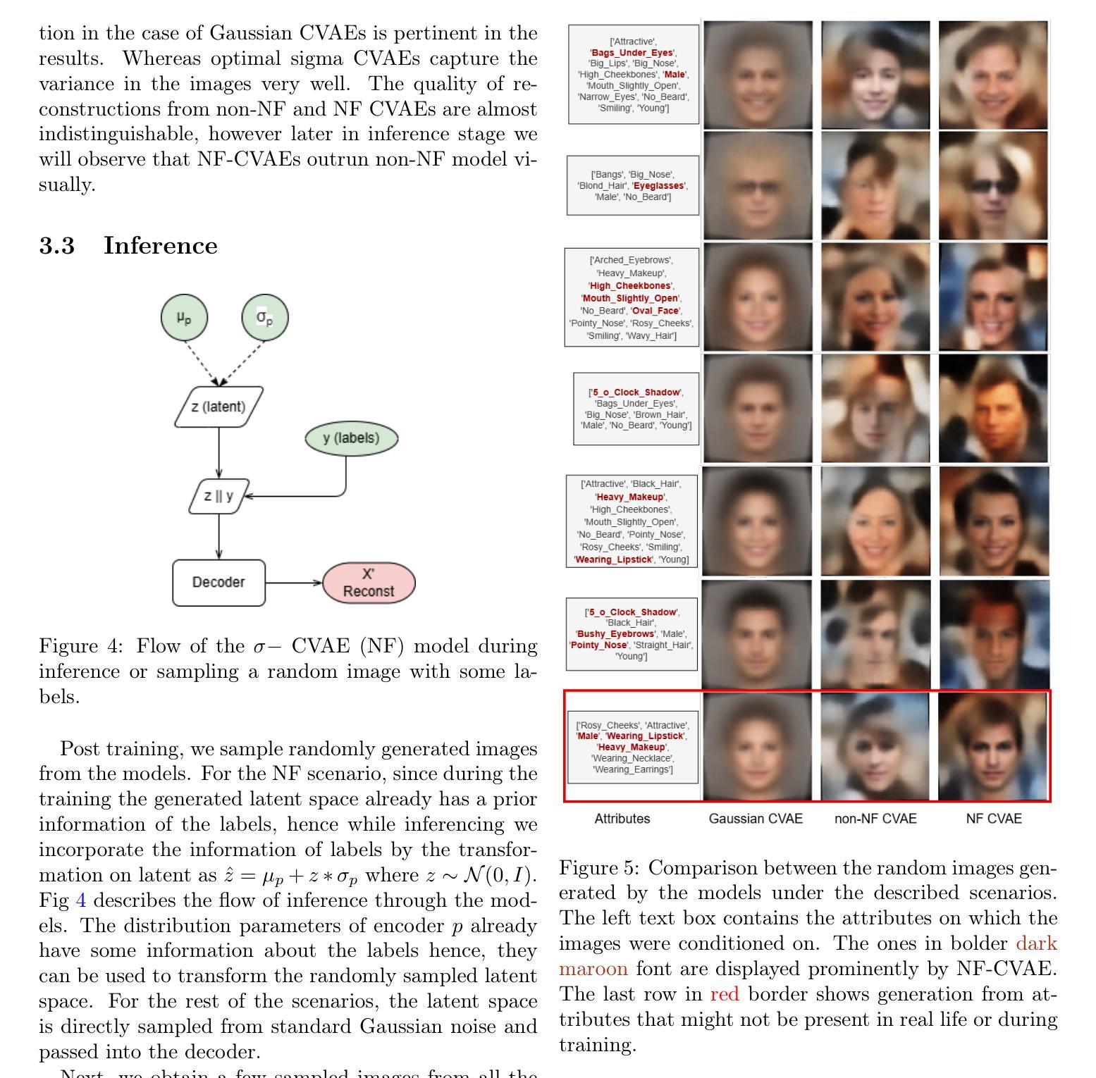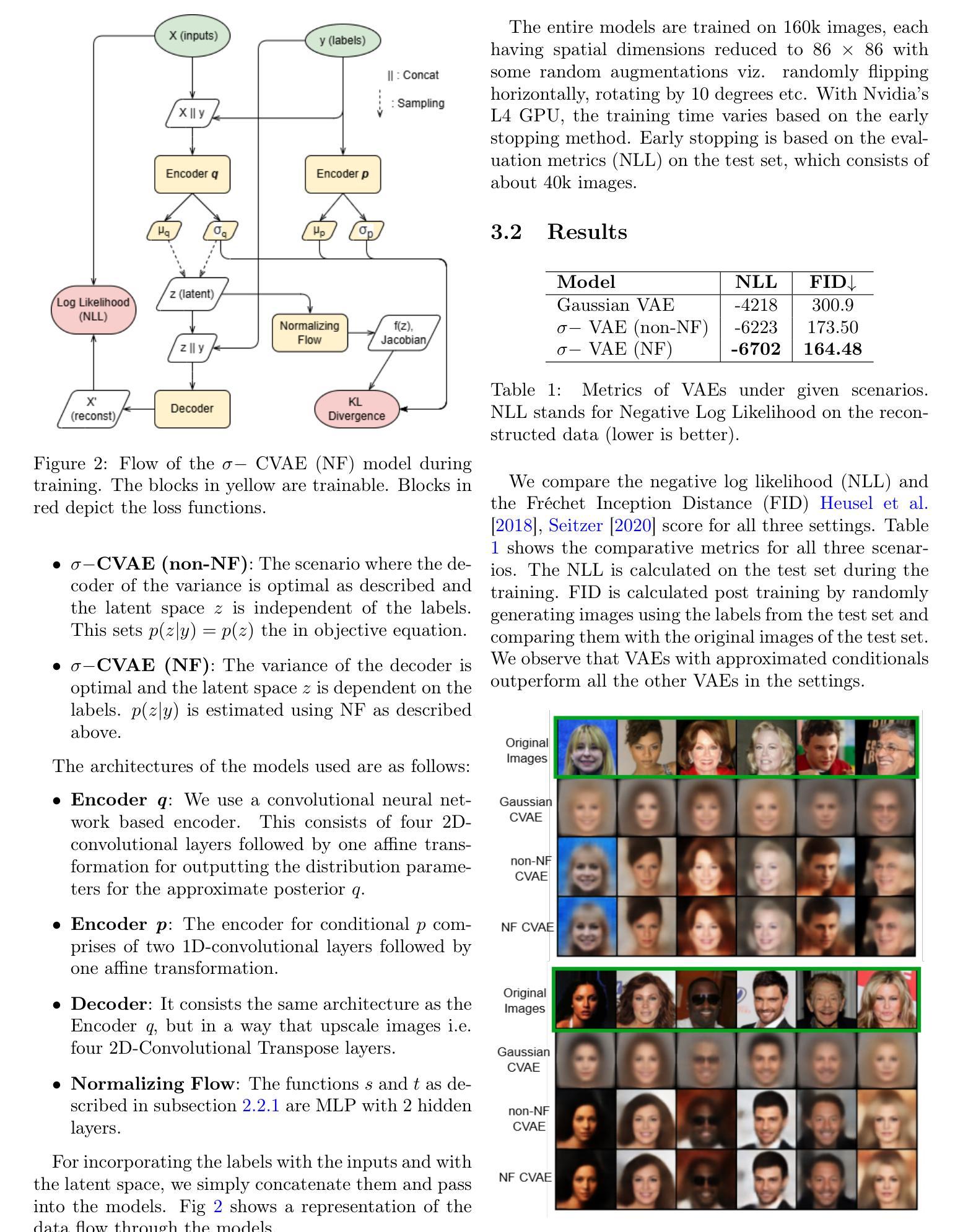变分自编码器和生成对抗网络在2022年之前一直是先进的生成模型。如今它们已被基于扩散的模型所取代。因此,改进传统模型的努力陷入了停滞。我们以传统的方式探索了使用条件变分自编码器(CVAE)进行图像生成,以在图像中融入所需的属性。已知VAE会产生模糊且多样性较少的图像,我们提出了一种方法,通过利用高斯解码器的方差作为训练过程中的可学习参数来解决这个问题。关于CVAE的先前工作假设给定标签的潜在空间条件分布等于先验分布,但现实中并非如此。我们展示了通过使用规范化流对其进行估算,与现有方法相比,我们的方法在图像生成方面表现得更好,将FID降低了5%,对数似然增加了7.7%。