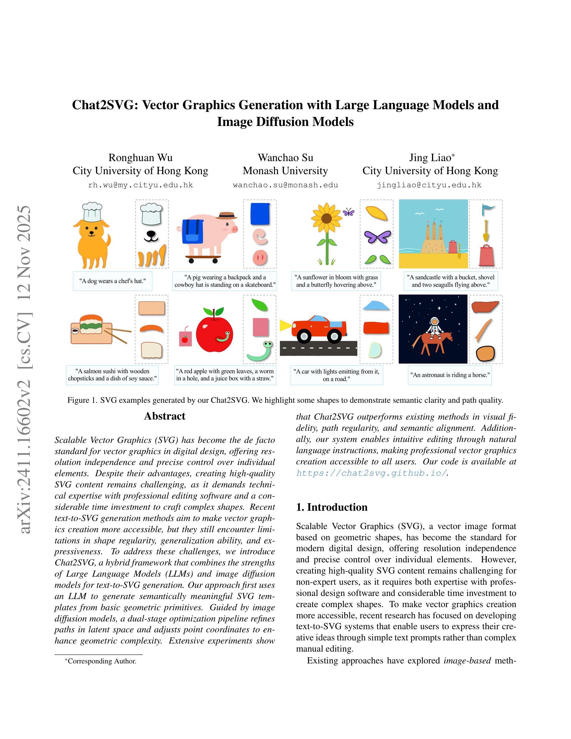 SVG已成为数字设计的矢量图形标准,但在创建高质量SVG内容时仍存在挑战。为解决挑战,提出Chat2SVG混合框架,结合大型语言模型(LLM)和图像扩散模型进行文本到SVG的生成。该方法通过LLM生成有意义的SVG模板,并通过图像扩散模型进行路径优化和点坐标调整,从而提高几何复杂性。Chat2SVG在视觉保真度、路径规律性和语义对齐方面优于现有方法,并可通过自然语言指令进行直观编辑,使专业矢量图形创作对所有人可行。