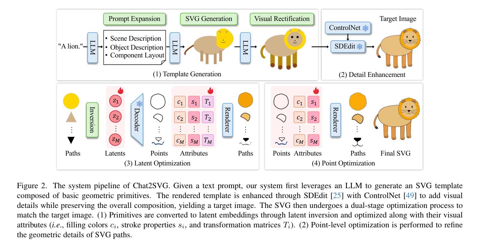 - Chat2SVG通过LLM生成有意义的SVG模板,并通过图像扩散模型进行精细化优化。