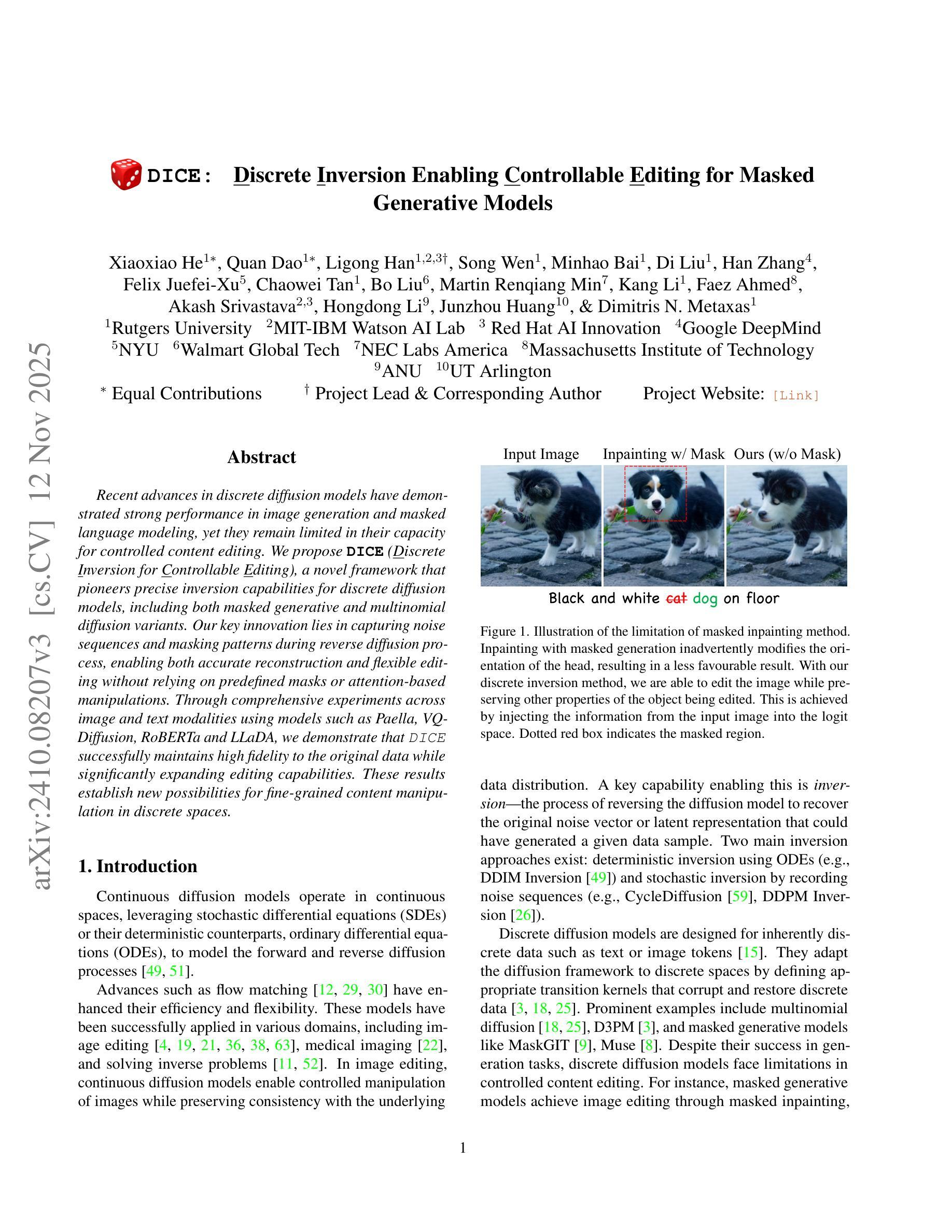 - DICE(Discrete Inversion for Controllable Editing)为离散扩散模型提供了精确反向的方法,实现了可控内容编辑。