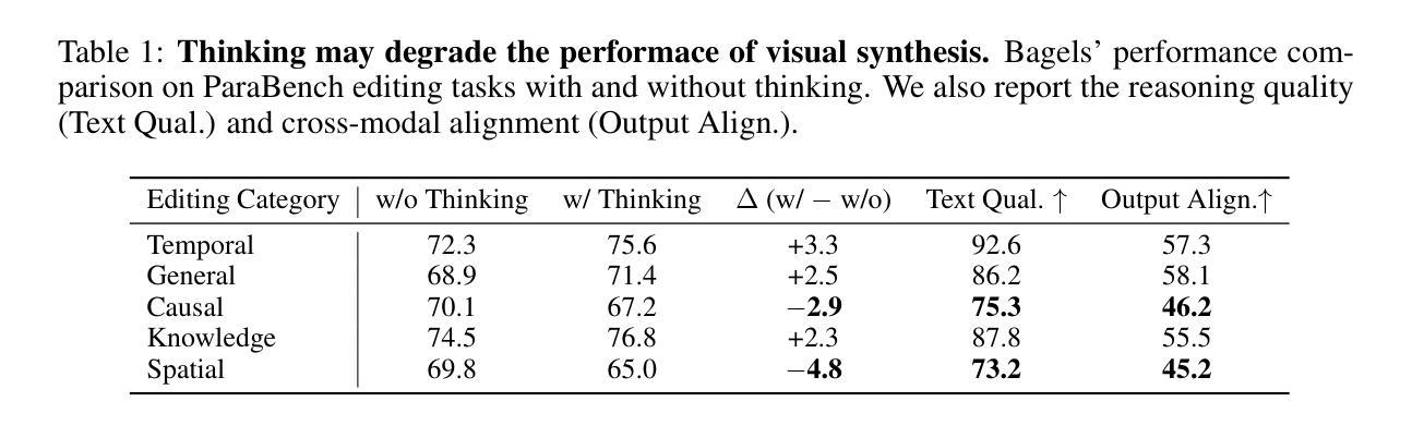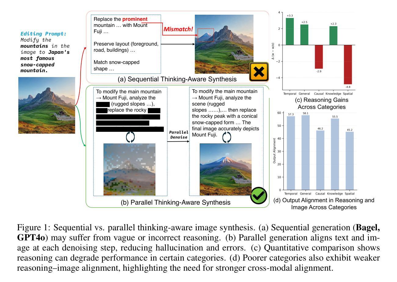 当我们考虑认知感知生成旨在提高复杂任务的性能时,我们发现了一种关键的失败模式,即现有的序列式、自回归方法会由于错误传播而悖论性地导致性能下降。为了系统地分析这一问题,我们提出了ParaBench,这是一种新的基准测试,旨在评估文本和图像输出模态的评估。我们利用ParaBench进行的分析表明,这种性能下降与生成推理和最终图像之间的对齐不佳之间存在强烈的相关性。