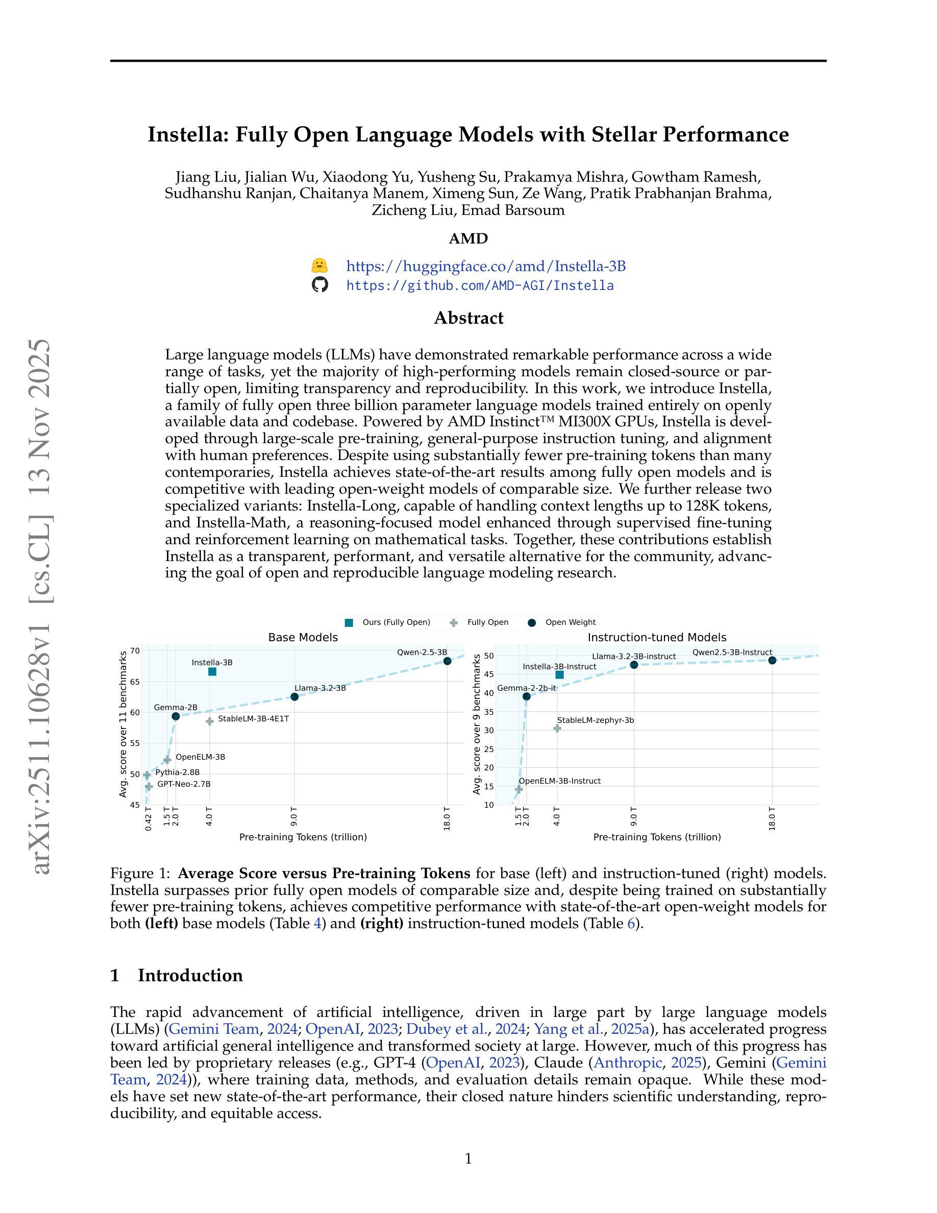 - 尽管使用了较少的预训练令牌,Instella在开源模型中实现了最先进的成果。
