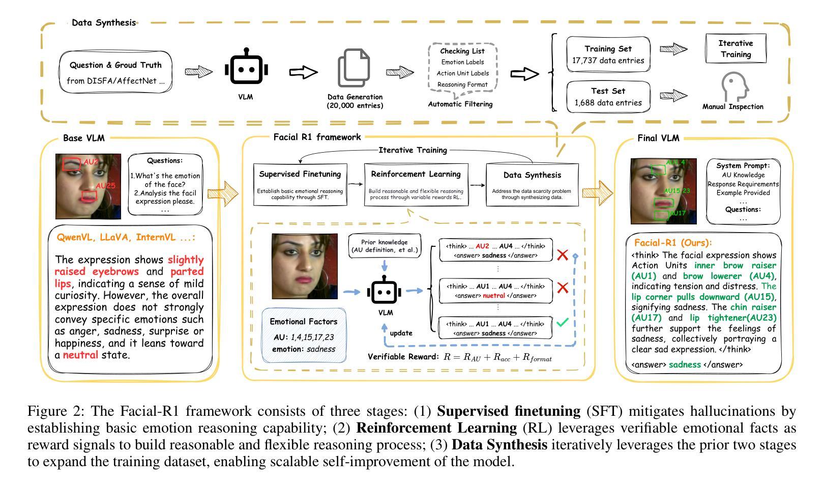 - Facial-R1框架通过三个阶段解决上述问题:指令微调、强化训练和基于情感与AU标签的数据合成管道设计。