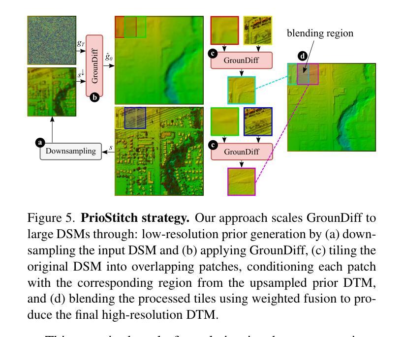 数字地形模型(DTM)代表地面高程,在众多的地理空间应用中具有重要意义。此类数据模型无法由传感器直接测量,通常是由激光雷达或摄影测量的数字表面模型(DSM)派生而来。传统的过滤方法依赖于手动调整的参数,而基于学习的方法则需要精心设计架构,通常结合后期处理。为了解决这些挑战,我们引入了Ground Diffusion(GrounDiff),这是第一个基于扩散的框架,通过将其制定为去噪任务来迭代地去除非地面结构。我们采用带有置信引导生成的门控设计,以实现选择性过滤。为了提高可扩展性,我们进一步提出了Prior-Guided Stitching(PrioStitch),它采用使用GrounDiff自动生成的降采样全局先验来指导局部高分辨率预测。我们在不同的数据集上评估了我们在DSM到DTM转换任务上的方法,结果表明GrounDiff始终优于基于深度学习的前沿方法,在ALS2DTM上减少了高达93%的RMSE,在USGS基准测试中减少了高达47%的RMSE。在道路重建任务中,既需要高精度也需要平滑度,我们的方法与GeRoD基准测试上的专用技术相比,距离误差降低了高达81%,同时使用仅使用DSM输入的竞平台面平滑度,无需针对任务进行优化。我们为道路重建设计的变体GrounDiff+能够产生更平滑的表面,进一步超越了前沿方法。项目页面可在https://deepscenario.github.io/GrounDiff/访问。