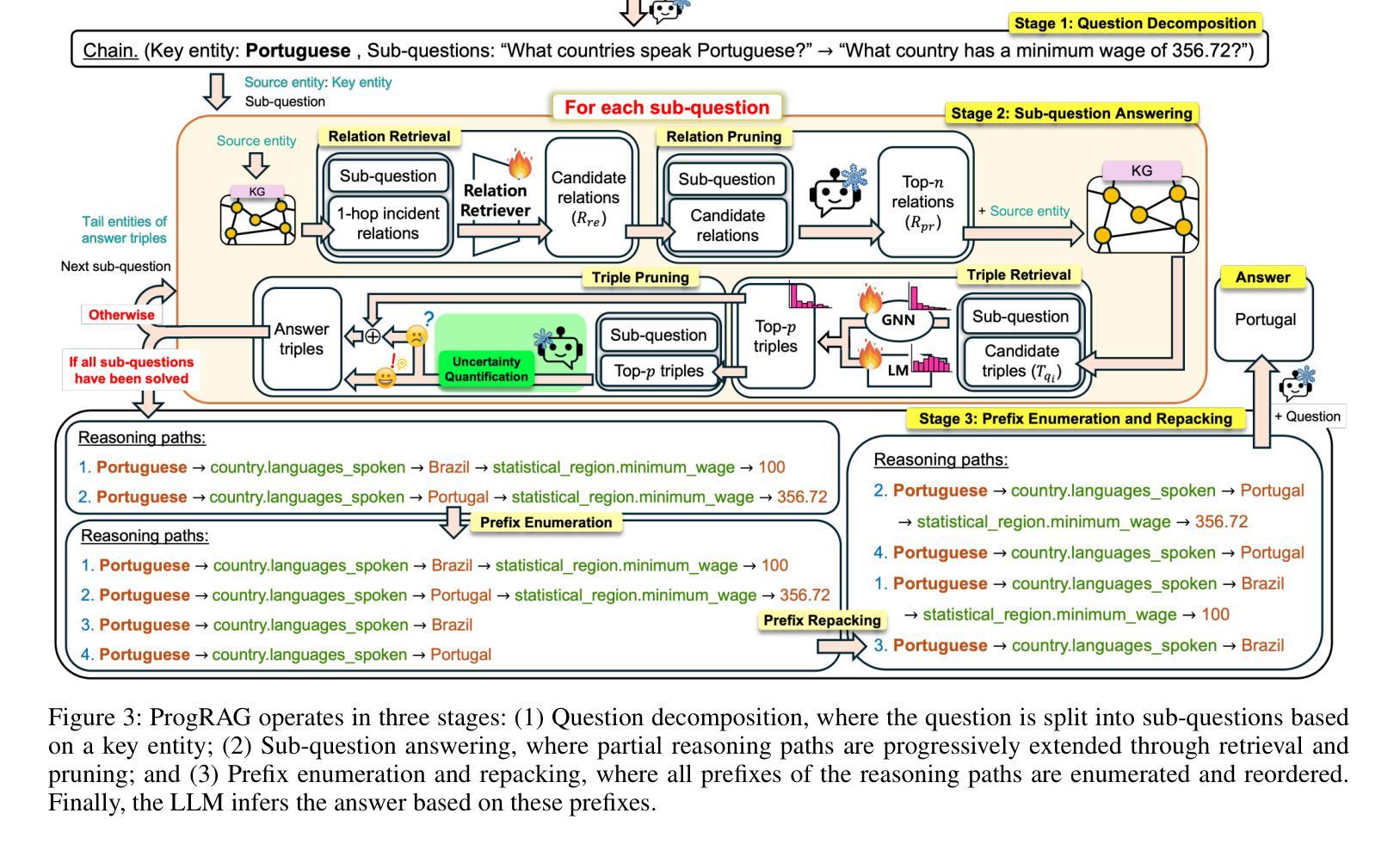 大型语言模型(LLM)展现出强大的推理能力,但在幻觉和透明度方面存在局限。最近,集成知识图谱(KGs)的KG增强LLM已被证明可以改善推理性能,特别是对于复杂、知识密集型的任务。然而,这些方法仍然面临重大挑战,包括检索不准确和推理失败,这些挑战往往因长输入语境而加剧,相关信息的语境遮蔽或不同问题类型所需的更丰富逻辑方向难以捕捉。此外,许多这些方法依赖于LLM直接从KGs中检索证据,并自我评估证据的充分性,这往往导致过早或错误的推理。为了解决检索和推理失败的问题,我们提出了ProgRAG,这是一个多跳知识图谱问答(KGQA)框架,它将复杂问题分解为子问题,并通过回答每个子问题来逐步扩展部分推理路径。在每一步中,外部检索器收集候选证据,然后通过不确定性感知修剪由LLM进行精炼。最后,通过对从子问题答案中获得的局部推理路径进行组织和重新排列,优化LLM推理的上下文。在三个知名数据集上的实验表明,ProgRAG在多跳KGQA方面的性能超过了现有基线,提高了可靠性和推理质量。
