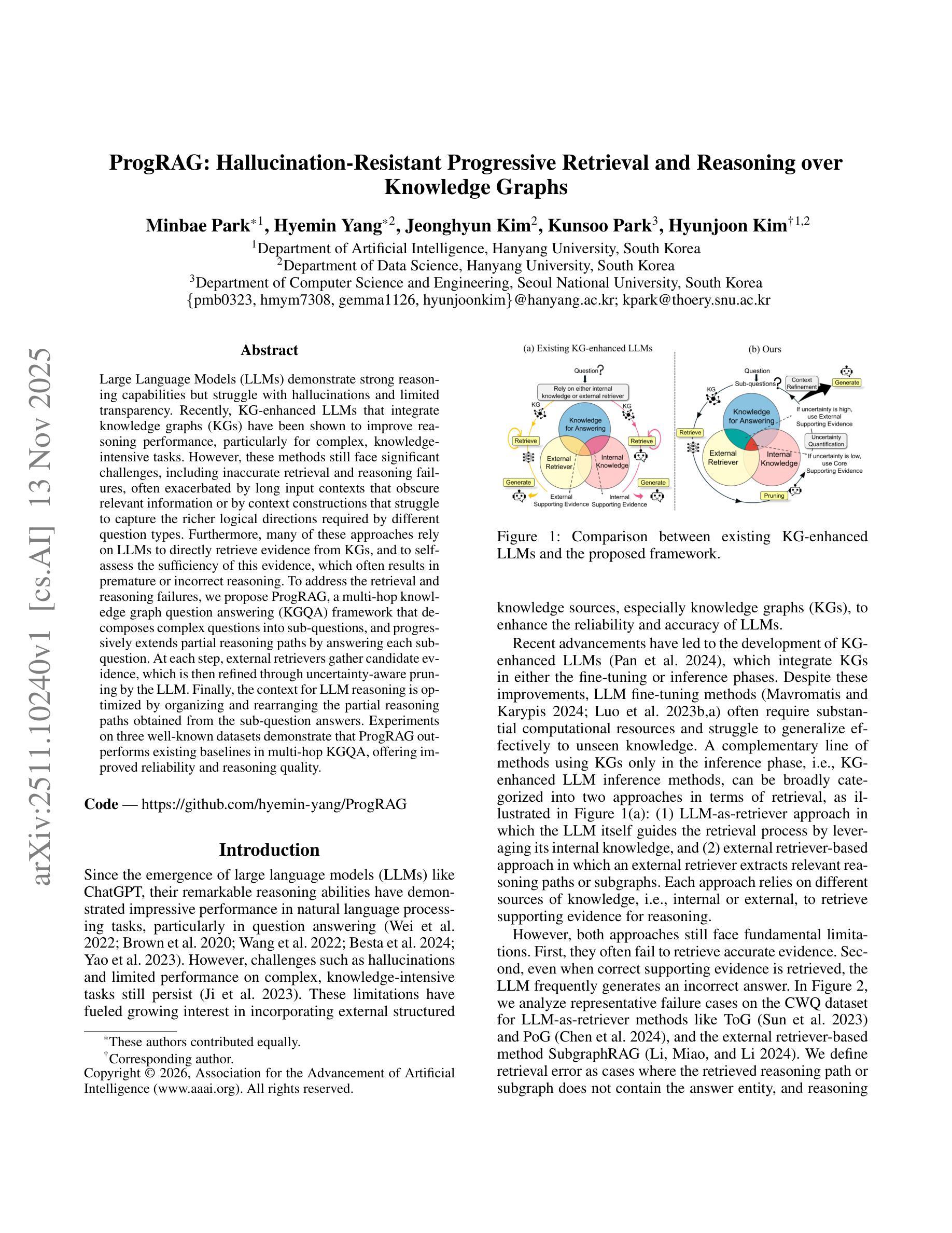 大型语言模型(LLMs)具备强大的推理能力,但在幻觉和透明度方面存在局限。融合知识图谱(KGs)的KG增强LLMs在复杂、知识密集型任务中改善了推理性能,但仍面临不准确检索和推理失败等挑战。为解决这些问题,提出ProgRAG多跳知识图谱问答(KGQA)框架,通过分解复杂问题为子问题,逐步扩展部分推理路径。实验证明,ProgRAG在多跳KGQA中优于现有基线,提高了可靠性和推理质量。