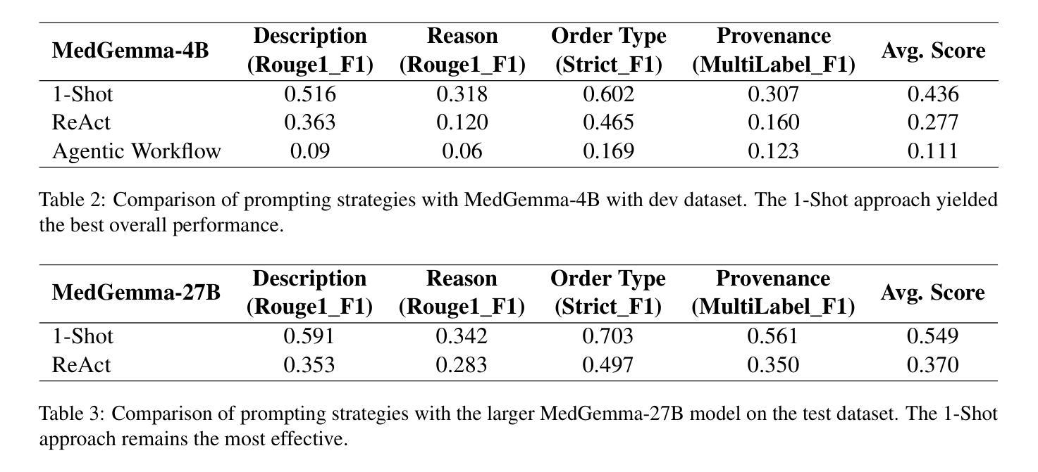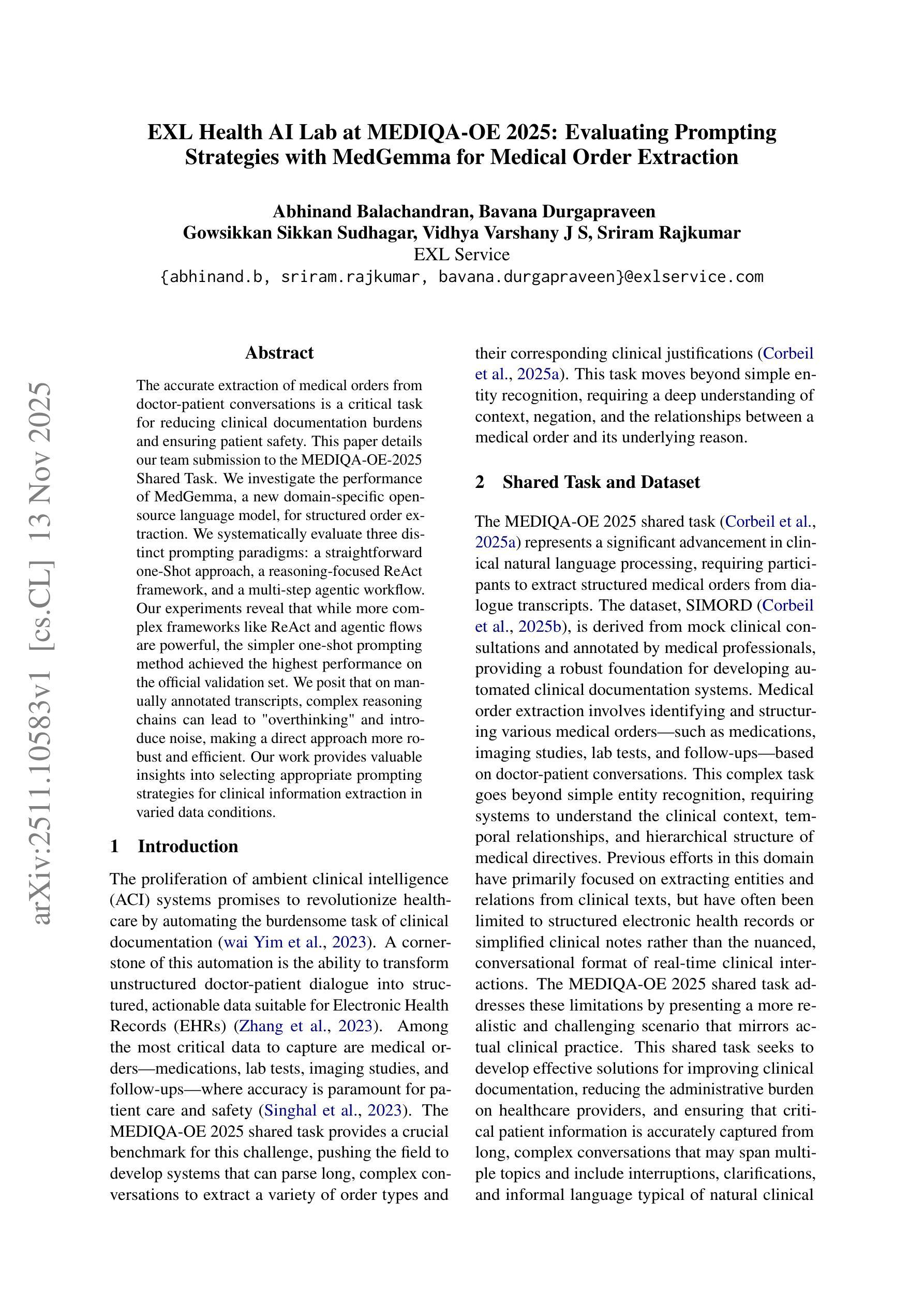 从医生与患者对话中准确提取医疗指令是减轻临床文档负担和确保患者安全的关键任务。本文详细介绍了我们团队对MEDIQA-OE-2025共享任务的提交内容。我们调查了MedGemma(一种新的特定领域的开源语言模型)在结构化指令提取方面的性能。我们系统地评估了三种不同的提示范式:直接的One-Shot方法、注重推理的ReAct框架和多步代理工作流程。我们的实验表明,虽然像ReAct和代理流程这样的更复杂框架很强大,但更简单的一次性提示方法却在官方验证集上取得了最高性能。我们认为,在手动注释的文本中,复杂的推理链可能会导致“过度思考”并引入噪音,使直接方法更加稳健和高效。我们的工作提供了在多种数据条件下选择适当提示策略进行临床信息提取的宝贵见解。