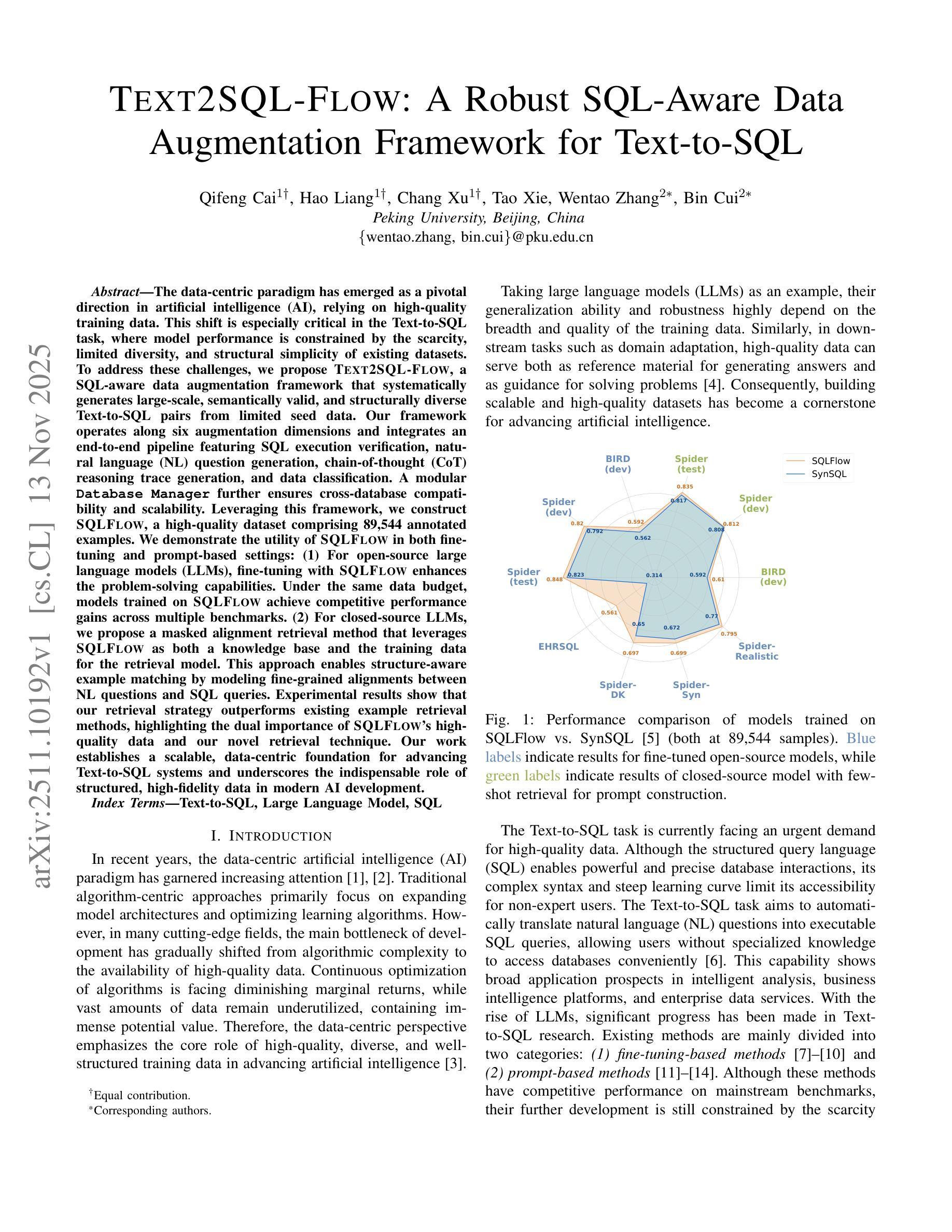 数据为中心的范式在人工智能中已成为关键,特别是在文本到SQL的转换中,其性能受限于稀缺、简单和低多样性的数据集。为解决此问题,我们提出了Text2SQL-Flow,这是一个SQL感知的数据增强框架,可从少量种子数据中生成大规模、语义有效且结构多样的文本到SQL对。它在六个增强维度上运行,并集成了一个端到端的管道,具有SQL执行验证、自然语言问题生成、思维链推理跟踪和数据分类等功能。模块化数据库管理器确保跨数据库兼容性和可扩展性。使用此框架,我们构建了SQLFlow数据集,其中包含89,544个注释示例。我们在两种环境下对SQLFlow进行了评估:(1)对于开源大型语言模型,在相同的数据预算下,对SQLFlow进行微调可以始终改善跨基准测试的性能。(2)对于封闭源代码的大型语言模型,我们引入了一种掩码对齐检索方法,将SQLFlow既视为知识库又作为检索器的训练数据。这通过建模问题和SQL查询之间的精细对齐,实现了结构感知的示例匹配。实验表明,我们的检索策略优于现有方法,突显了SQLFlow高保真数据的价值和我们的新技术。我们的工作为推进文本到SQL系统的技术建立了可扩展的、以数据为中心的基础,并强调了高质量结构化数据在现代人工智能中的关键作用。