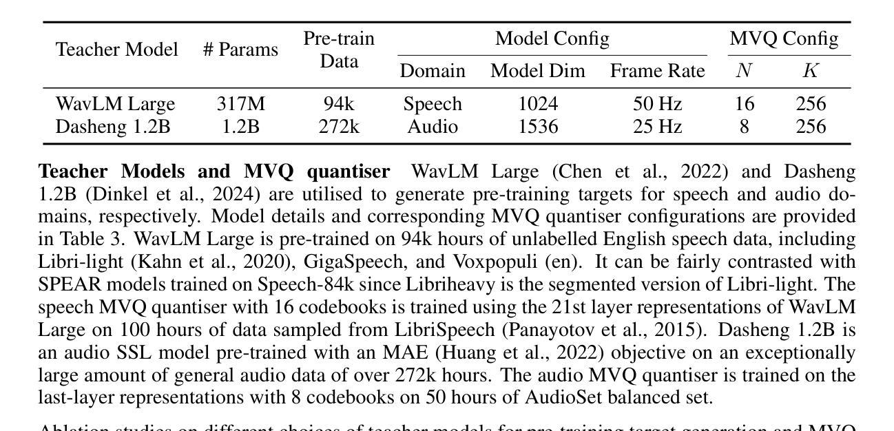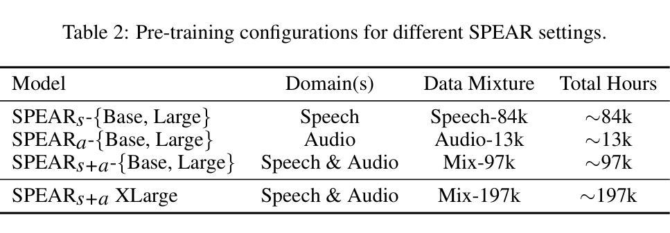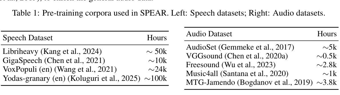 - SPEAR通过掩码预测精细离散标记的方法实现预训练目标,适用于语音和通用音频。