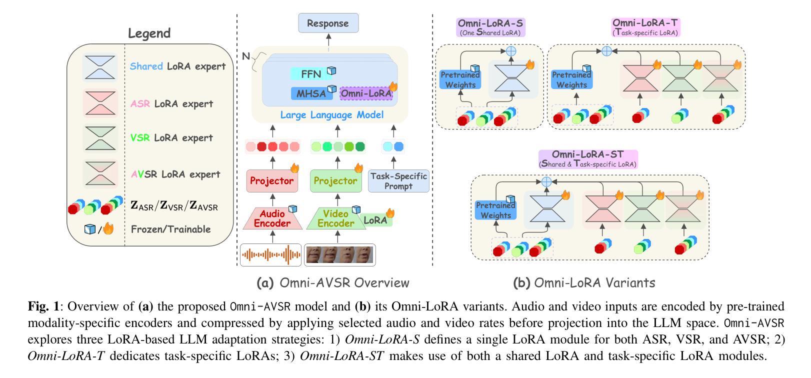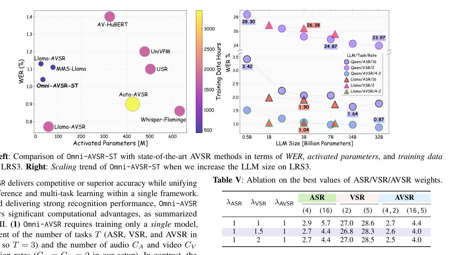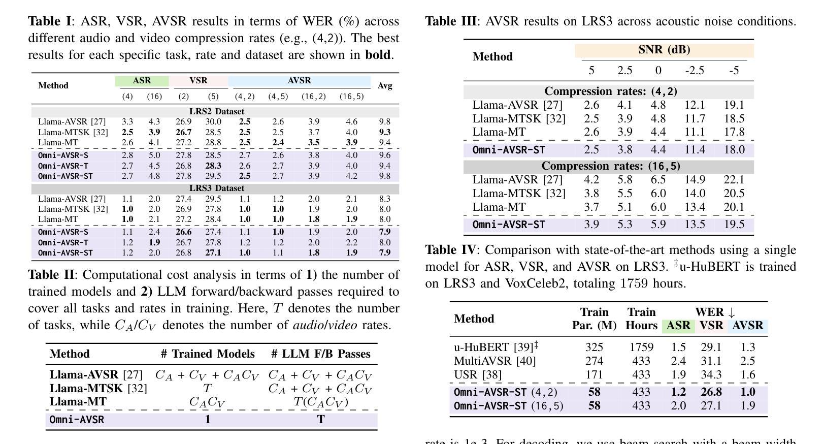 - Omni-AVSR采用高效多粒度训练和参数高效适应技术。