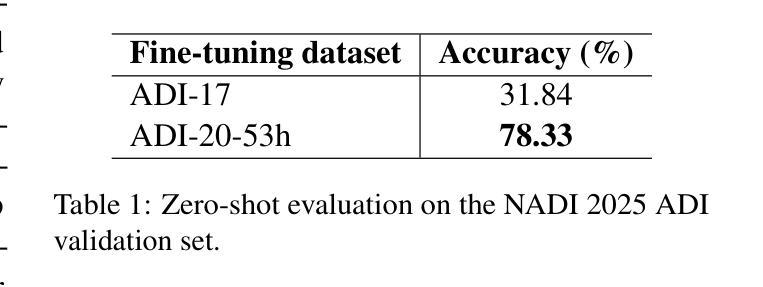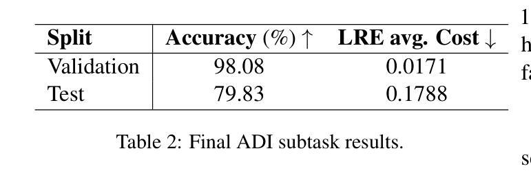 - ADI系统的最高准确率为79.83%,应用了数据增强技术和Whisper-large-v3编码器。
