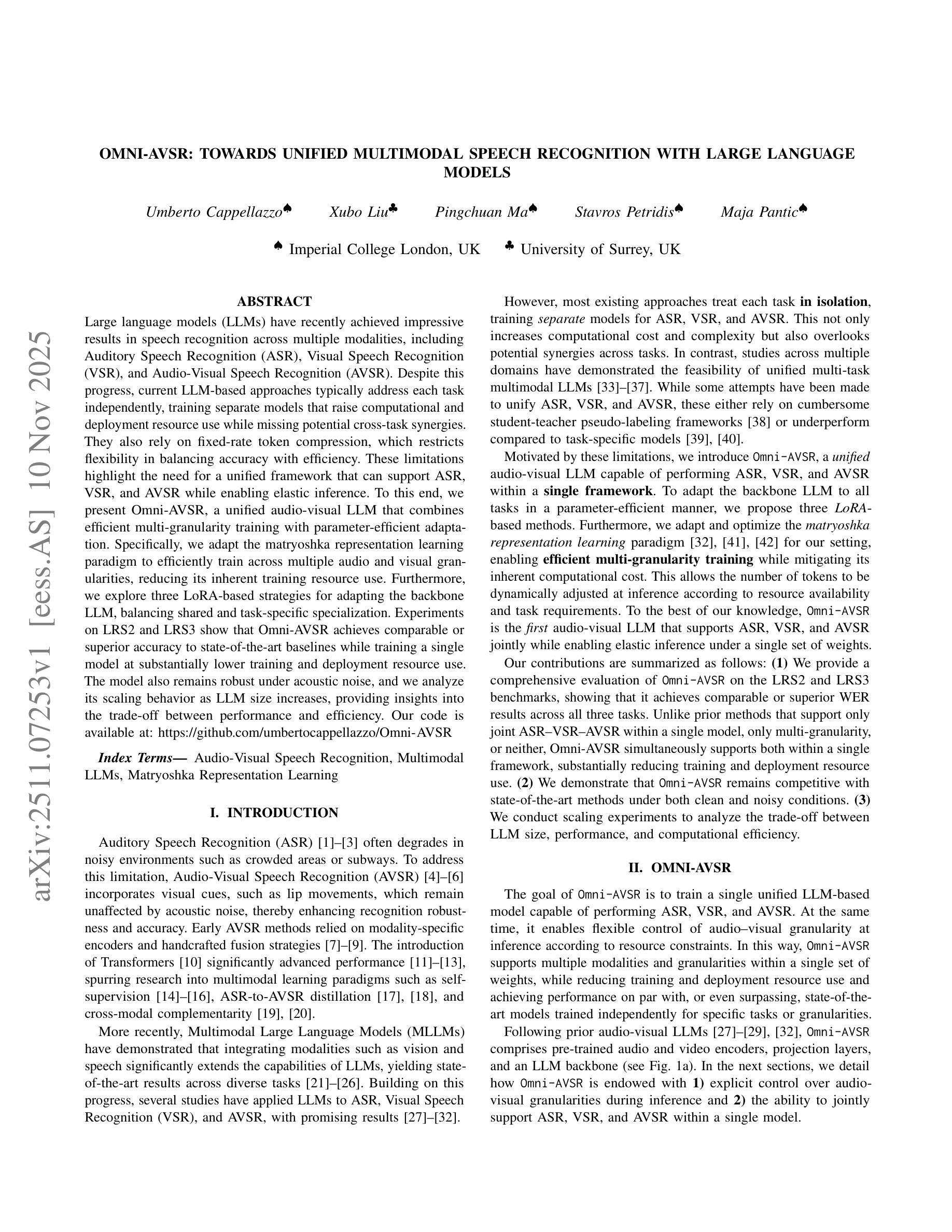 大型语言模型(LLM)在语音识别多个领域取得了显著成果,包括听觉语音识别(ASR)、视觉语音识别(VSR)和视听语音识别(AVSR)。然而,当前LLM方法通常独立处理每项任务,训练单独模型,导致计算与部署资源消耗较大,且无法充分利用跨任务协同作用。此外,它们依赖于固定速率令牌压缩,难以在准确性与效率之间取得平衡。为此,提出了Omni-AVSR统一音频视觉LLM框架,结合高效多粒度训练和参数高效适应技术。通过适应matryoshka表示学习范式,可在多个音频和视觉粒度上实现高效训练,降低固有资源消耗。实验表明,Omni-AVSR在LRS2和LRS3上实现了与最佳基准相当的准确率,同时大幅降低了训练和部署的资源消耗。模型在噪声环境下保持稳健性,并分析了随着LLM规模增加,性能与效率之间的权衡。