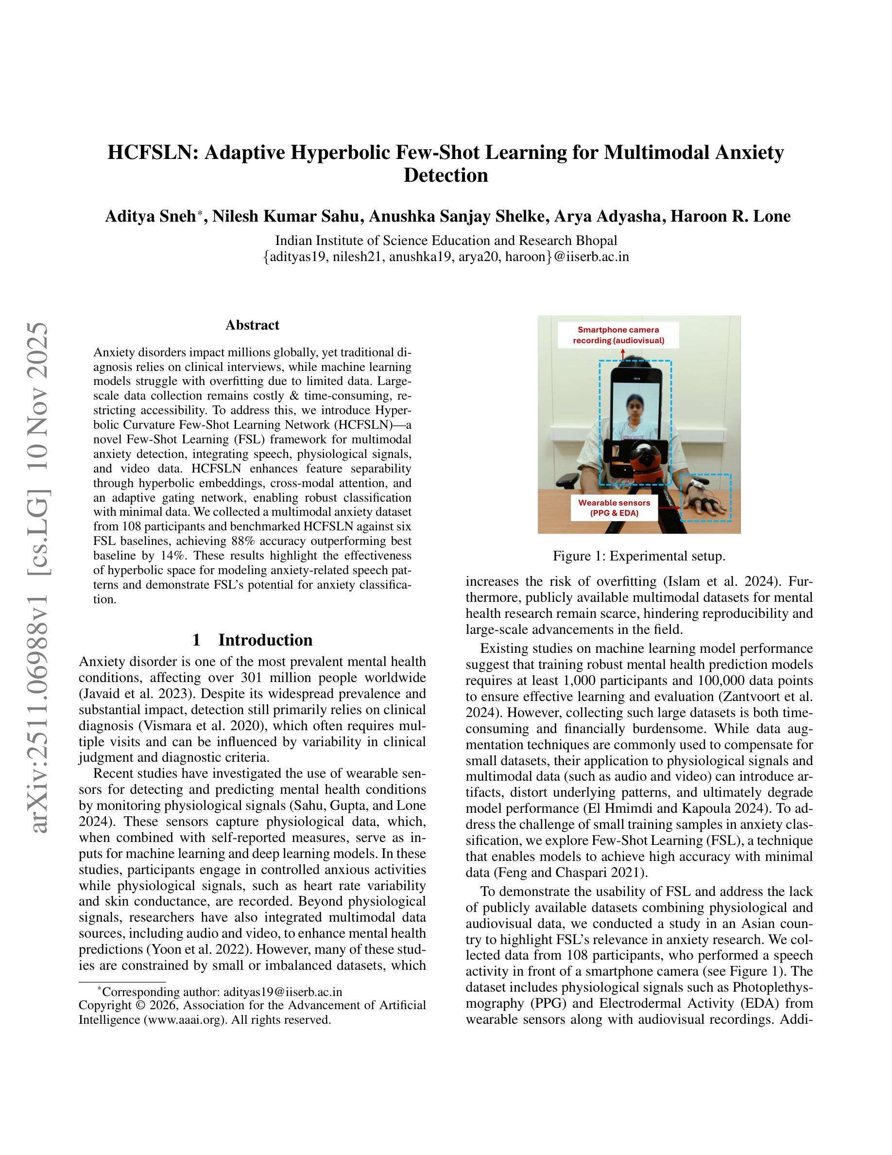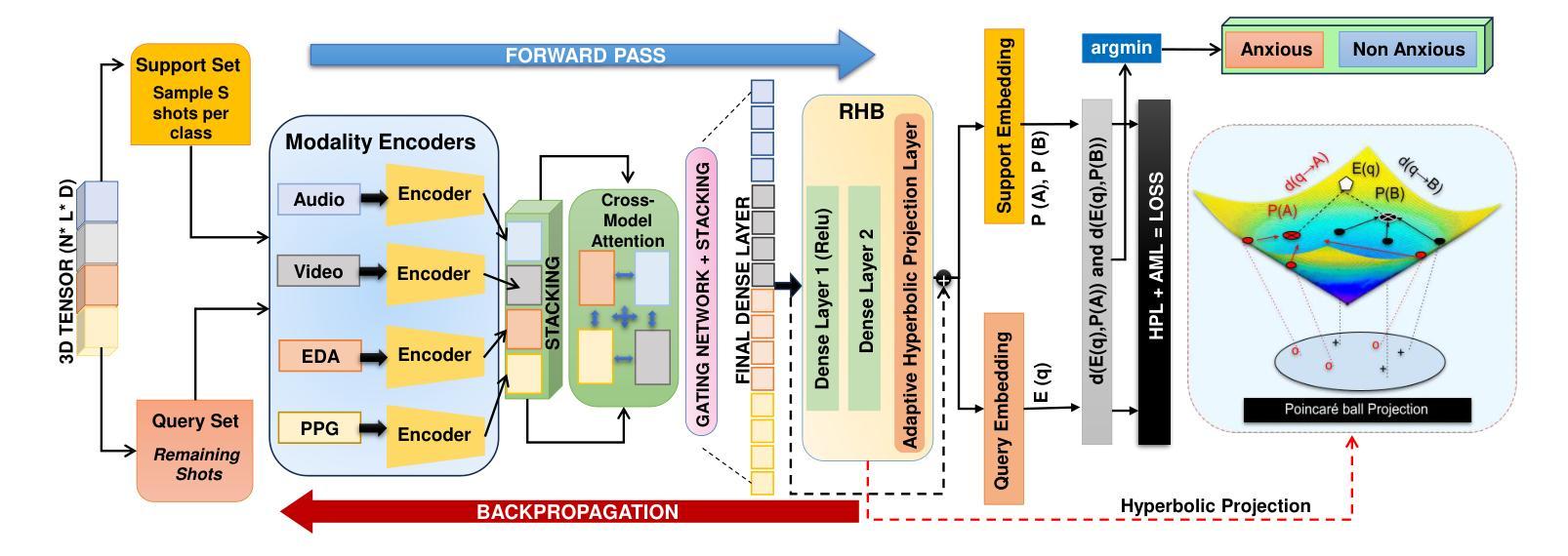 焦虑障碍影响了全球数百万人,然而传统诊断依赖于临床访谈,而机器学习模型由于数据有限而面临过拟合的问题。大规模数据采集仍然成本高昂、耗时长,限制了可访问性。针对这一问题,我们引入了双曲曲面少量样本学习网络(Hyperbolic Curvature Few-Shot Learning Network,简称HCFSLN),这是一种用于多模式焦虑检测的新型少量样本学习(FSL)框架,融合了语音、生理信号和视频数据。HCFSLN通过双曲嵌入、跨模式注意力和自适应门控网络增强特征可分性,用最少的数据实现稳健的分类。我们从108名参与者中收集了多模式焦虑数据集,并将HCFSLN与六种FSL基准进行了评估,准确率达到88%,比最佳基准高出14%。这些结果突显了双曲空间在模拟焦虑相关语音模式方面的有效性,并展示了FSL在焦虑分类方面的潜力。