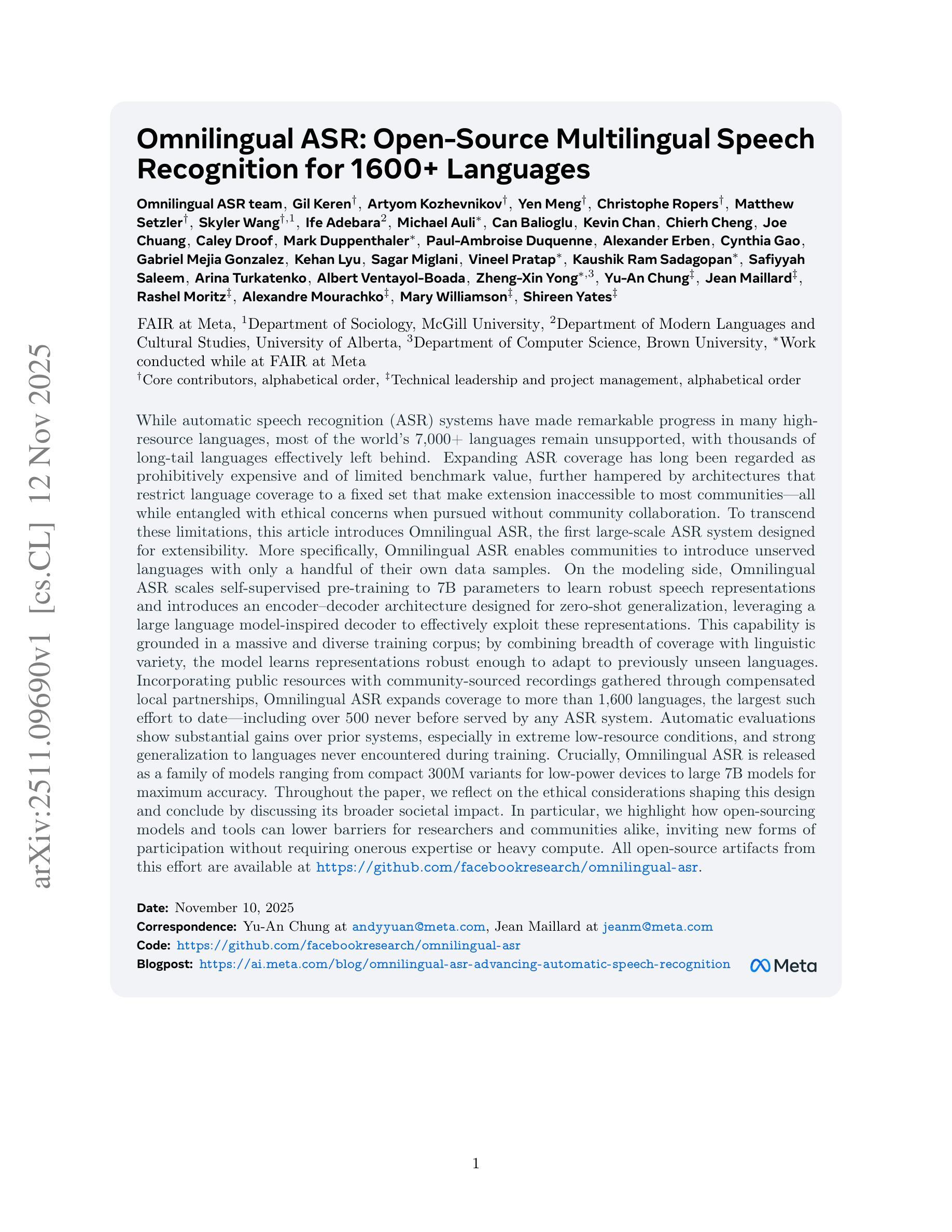 - Omnilingual ASR成功扩展了对超过1600种语言的支持,包括之前未受支持的500多种语言。