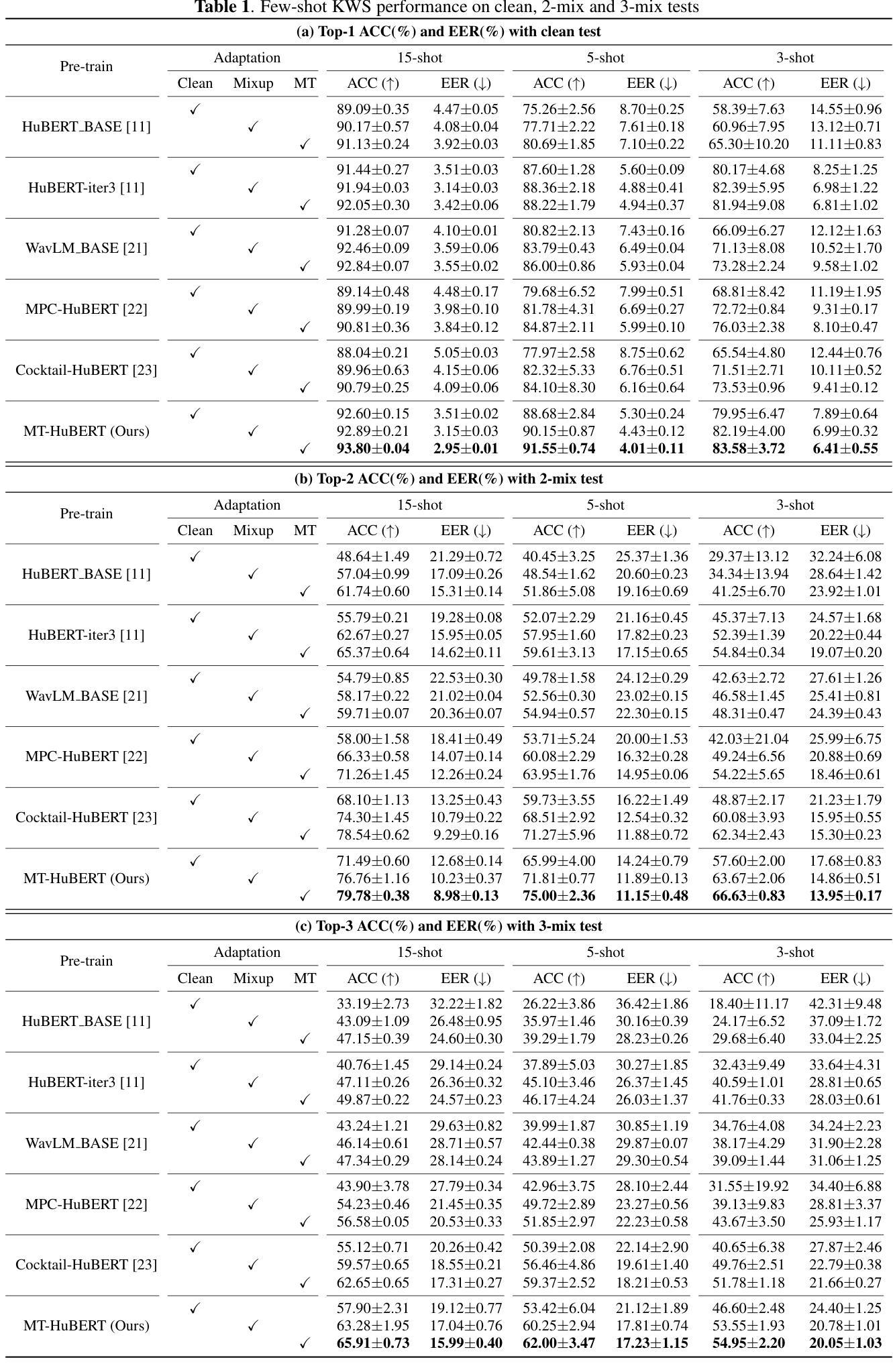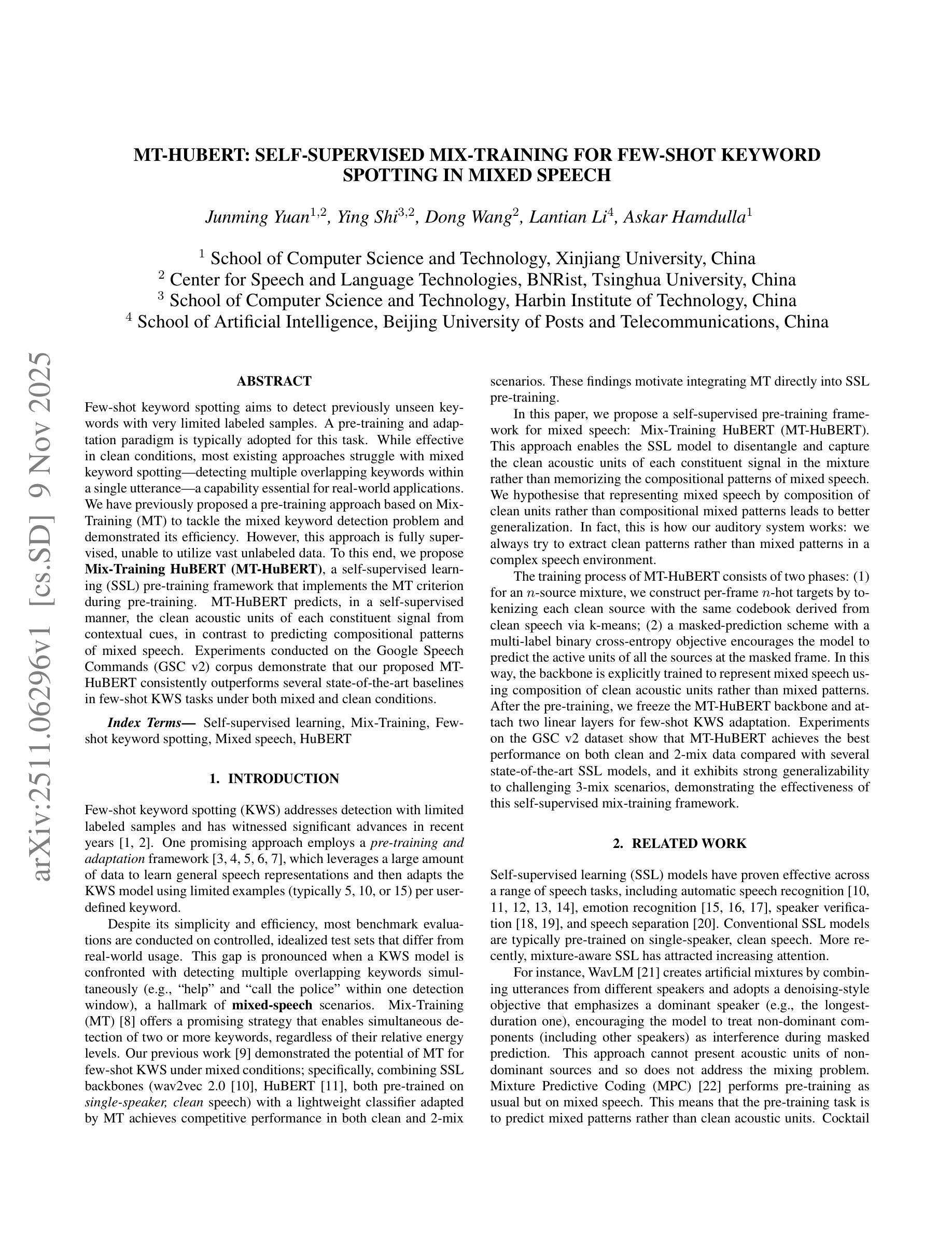 少数关键词识别旨在使用非常有限的标记样本检测先前未见的关键词。通常为此任务采用预训练和适应范式。尽管在清洁条件下有效,但大多数现有方法在处理混合关键词识别方面存在困难——在同一句话内检测多个重叠关键词——这是现实世界应用中的基本能力。我们之前提出了基于混合训练(MT)的预训练方法来解决混合关键词检测问题,并证明了其有效性。然而,这种方法是完全监督的,无法利用大量未标记数据。为此,我们提出了混合训练HuBERT(MT-HuBERT),这是一种自监督学习(SSL)预训练框架,在预训练期间实现了MT标准。MT-HuBERT以自监督的方式预测每个组成信号的清洁声学单元,而不是预测混合语音的组合模式。在Google语音命令(GSC v2)语料库上进行的实验表明,我们提出的MT-HuBERT在混合和清洁条件下均优于少数关键词识别任务中的几种最新基线方法。