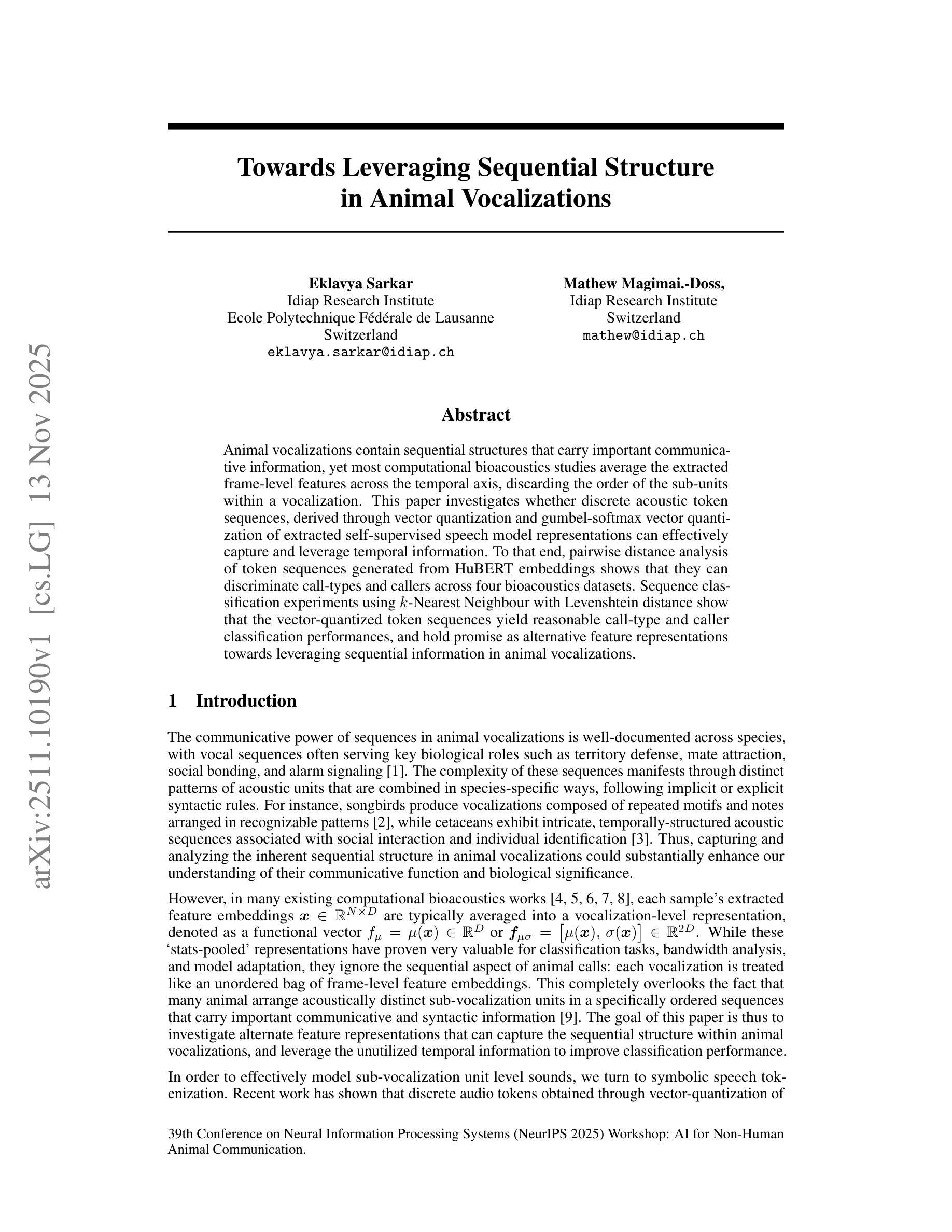 动物发出的声音包含重要的沟通信息,其声音序列结构是关键部分。然而,大多数计算生物声学的研究都是平均提取的帧级特征,忽略了声音子单元的时间顺序。本文探讨了通过向量量化和gumbel-softmax向量量化提取的自监督语音模型表示中的离散声学令牌序列是否能有效捕获和利用时间信息。为此,使用HuBERT嵌入生成的令牌序列的成对距离分析表明,它们可以在四个生物声学数据集中区分呼叫类型和呼叫者。使用Levenshtein距离的k近邻分类实验表明,向量量化的令牌序列在呼叫类型和呼叫者分类方面表现出良好的性能,并有望作为利用动物叫声中的序列信息的替代特征表示。