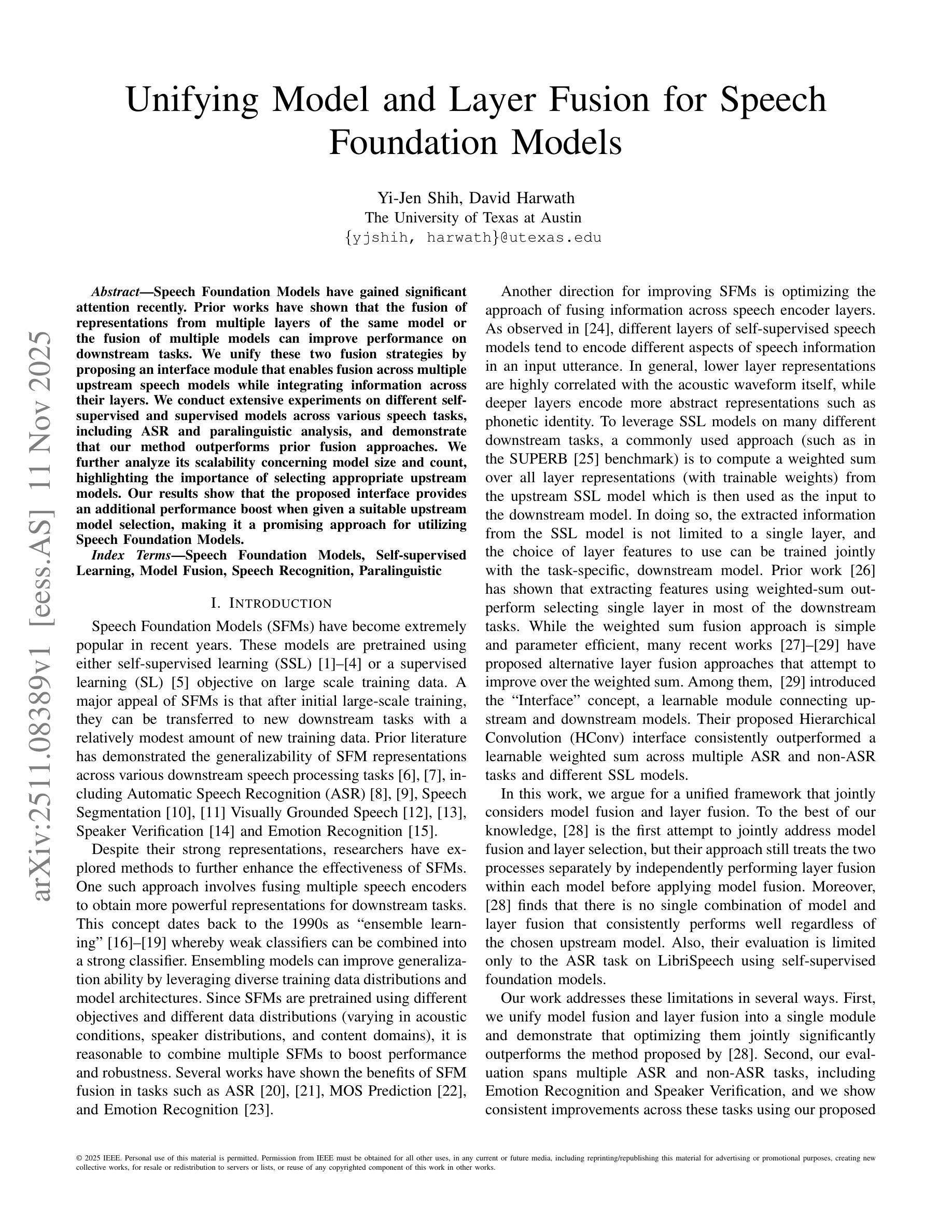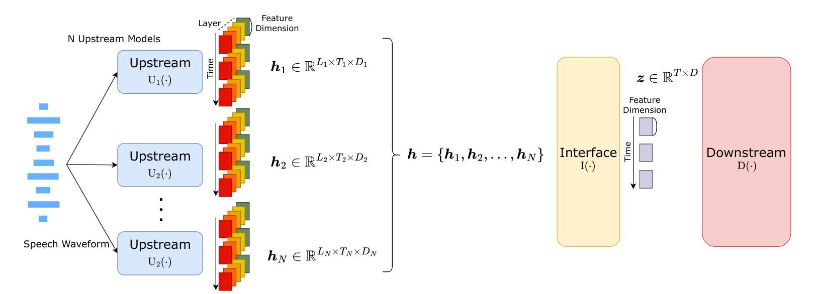 本文提出了一个跨多个上游语音模型的融合接口模块,该模块能够融合同一模型的多层表示或不同模型的信息,进而改善下游任务的性能。通过广泛的实验验证,该接口在多种自监督和有监督的语音模型上,包括语音识别和副语言分析任务,展现出优于先前融合方法的效果。同时,本文还分析了其关于模型大小和数量的可扩展性,并强调了选择适当上游模型的重要性。此接口为选择合适的上游模型提供了额外的性能提升,显示出其在应用语音基础模型中的前景。