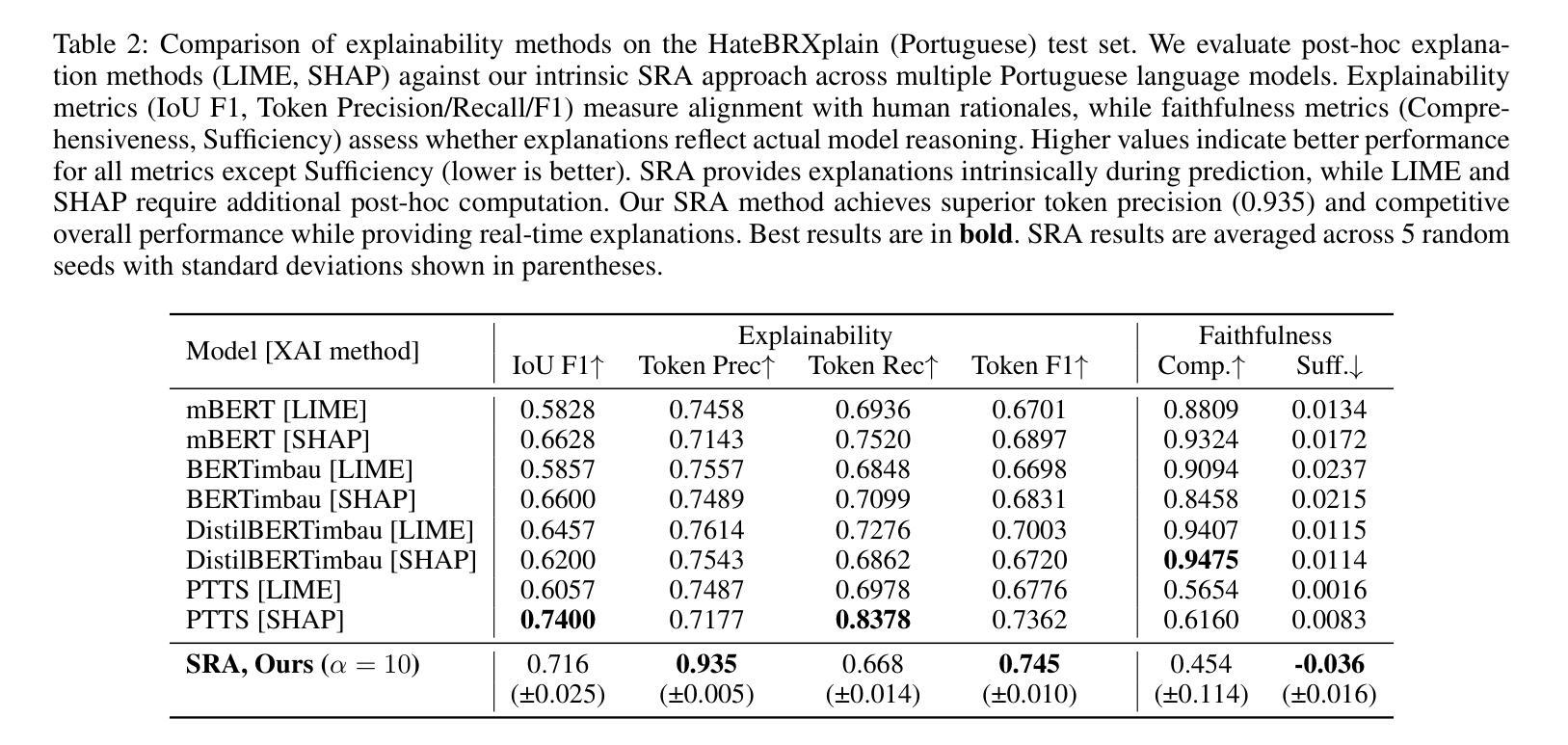 - 在英文和葡萄牙语的仇恨言论基准测试上,SRA实现了比现有方法更好的解释性。