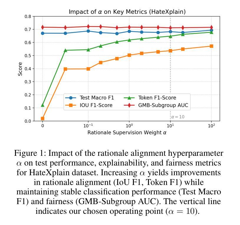 本摘要针对深度学习模型在仇恨言论检测系统中的不透明性所带来的伦理挑战,引入了一种名为Supervised Rational Attention(SRA)的框架。该框架通过明确将模型注意力与人类理性对齐,提高了仇恨言论分类中的可解释性和公平性。实验结果表明,SRA在英文(HateXplain)和葡萄牙语(HateBRXplain)的仇恨言论基准测试上取得了良好的表现,实现了比现有基线更高的解释性,并产生了更忠实于人类理解的词级解释。同时,SRA在公平性方面也表现出竞争力,在检测针对身份群体的有毒帖子时表现第二优秀,同时在其他指标上保持可比性结果。这些发现表明,将人类理性融入注意力机制可以在不损害公平性的情况下提高可解释性和忠实性。